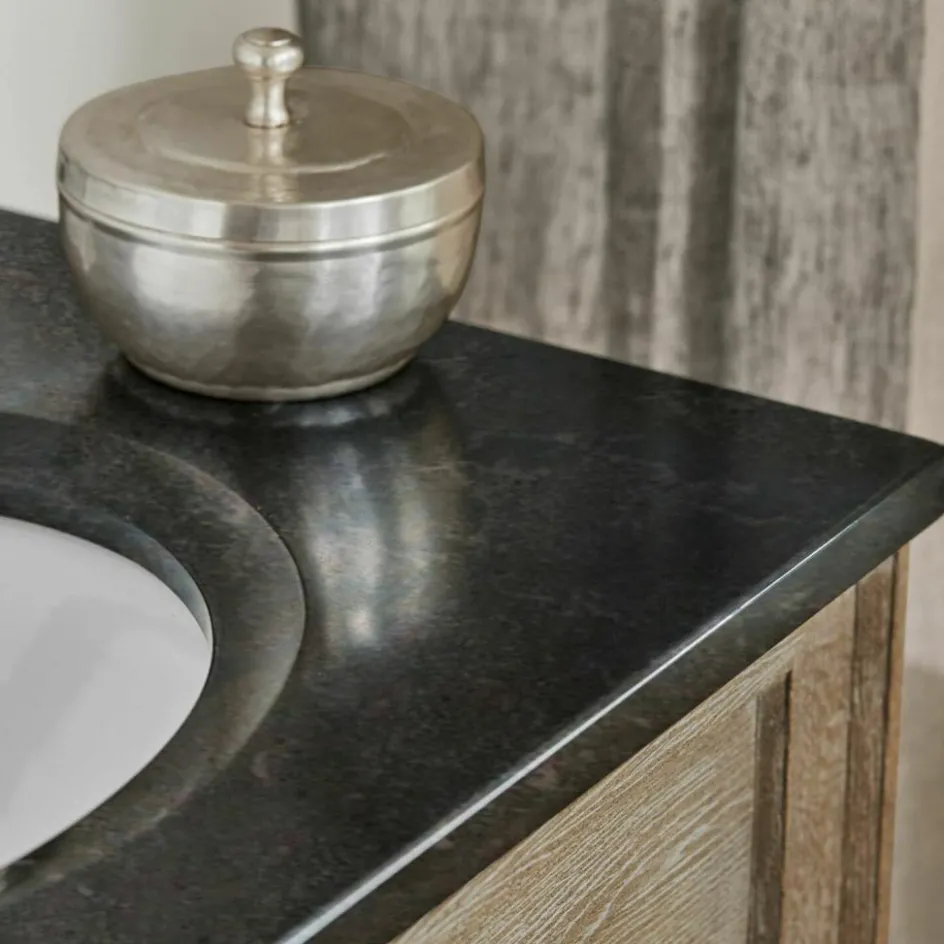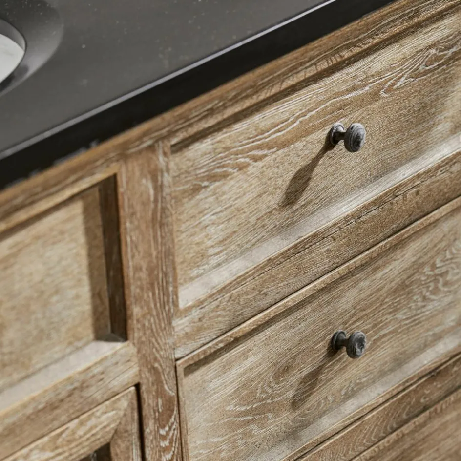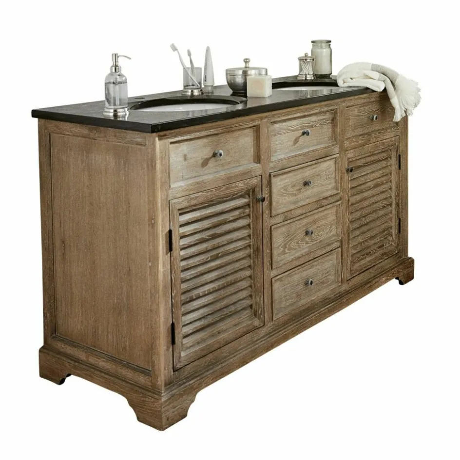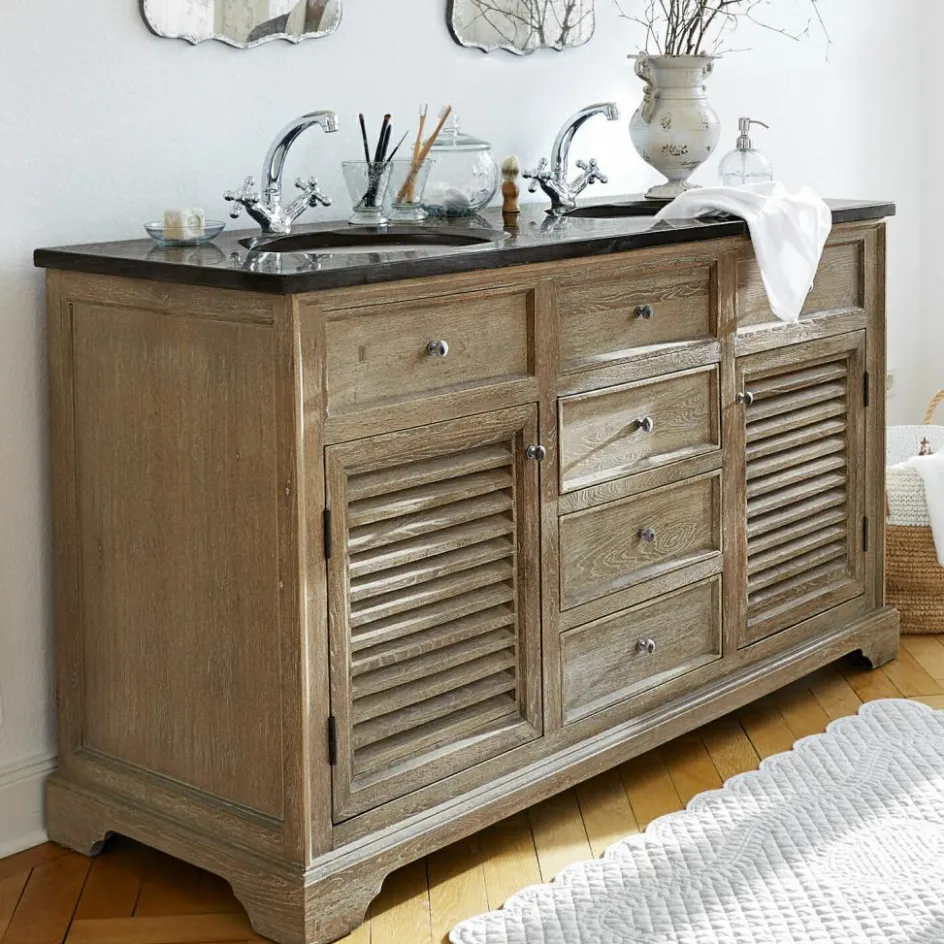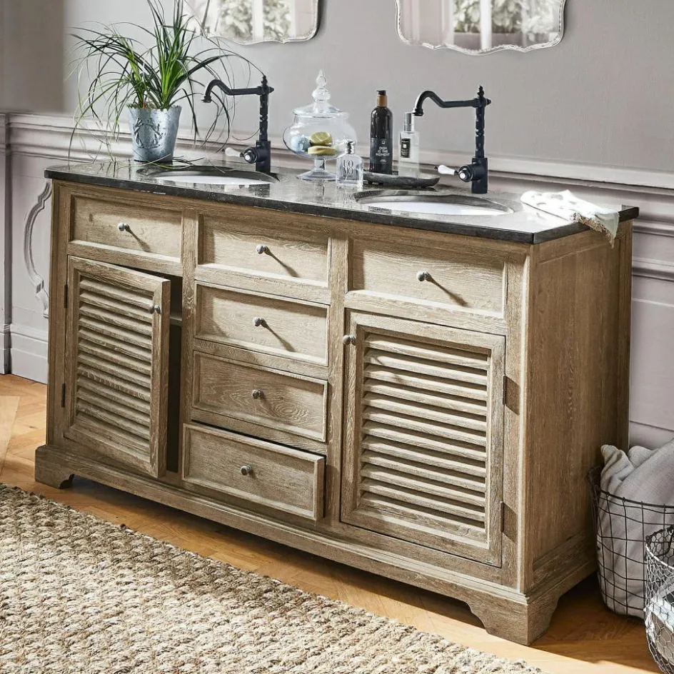 Der Waschtisch besticht mit seiner eleganten Erscheinung, einer schwarzen Natursteinplatte und mit einem handbearbeiteten Korpus aus massivem Eichenholz. Für ausreichend Stauraum sorgen drei geräumige Schubladen und zwei Fächer mit Lamellentüren. Die oberen drei Schubladen bilden die optische Blende für die beiden Keramik-Waschbecken. Diese wurden in die Steinplatte eingelassen und heben sich in strahlendem Weiß vom Rest des Möbels ab.