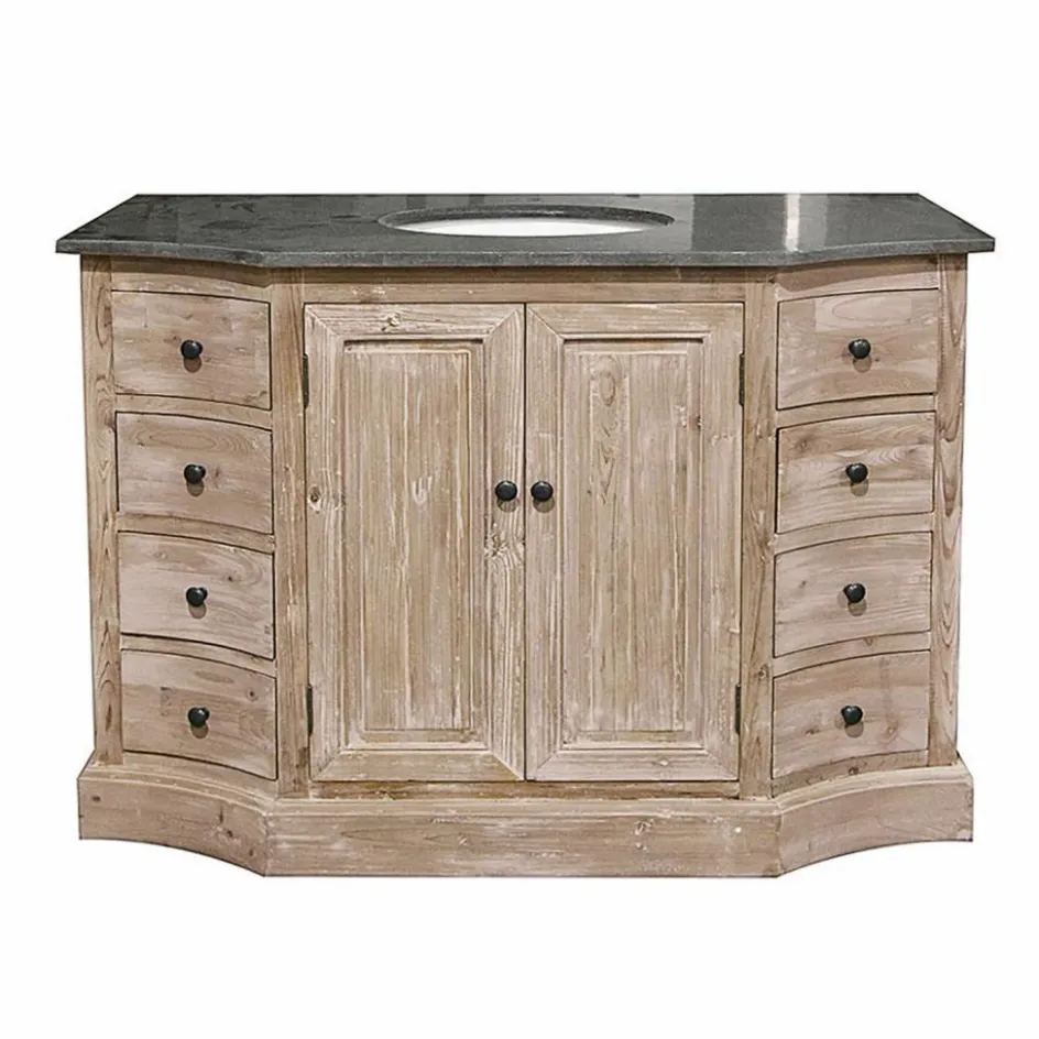 Hochwertige und vor allem natürliche Materialien wurden für diesen prächtigen Waschtisch kombiniert. Die dunkle Natursteinplatte, bildet einen tollen Kontrast zum Waschbecken und harmoniert wunderbar mit dem reizenden Tannenholzschrank in handgearbeiteter Qualität. Charmante Details wie gewölbte Schubladenfronten, raffinierte Zierelemente und eine hochwertige Antik-Lasur unterstreichen den edlen Look. Neben acht Schubladen, bieten zwei Fächer, ausreichend Platz für ihre Siebensachen. Natürlich unauffällig verborgen hinter zwei Türen in dezenter Kassettenoptik. Nicht im Lieferumfang enthalten sind die hier abgebildeten Armaturen und Syphon.