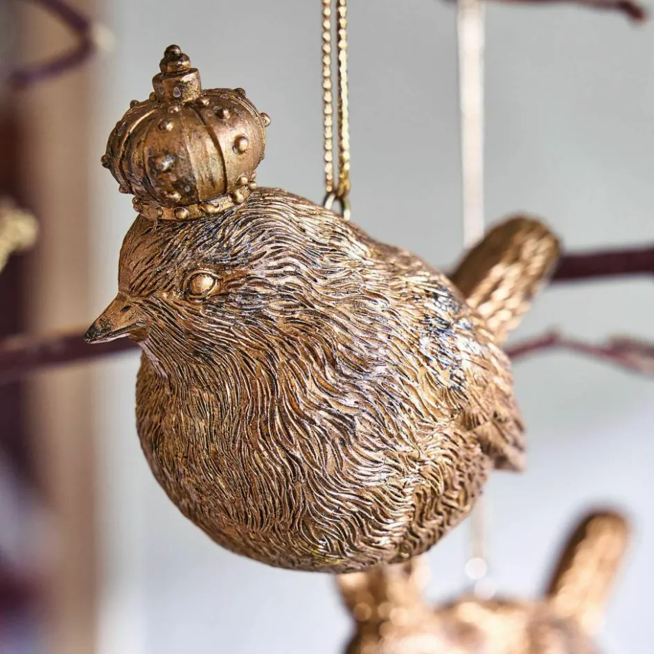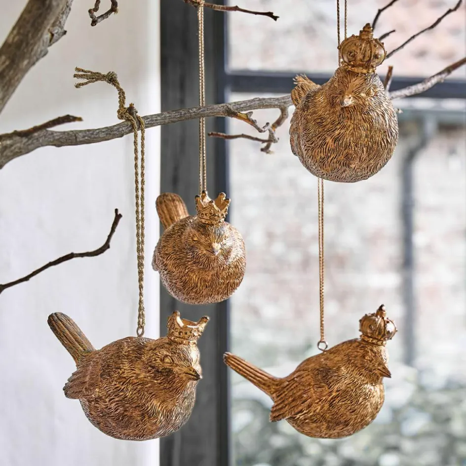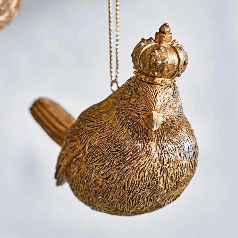 Wie kleine Könige thronen diese vier goldfarbenen Vögel auf Ihrem Weihnachtsbaum – jeder einzelne mit einer detailreich gearbeiteten Krone auf dem Kopf. Gefertigt aus Polyresin und veredelt mit einem Antikgold-Finish, begeistern die Anhänger durch ihre fein modellierte Federstruktur und den matten Schimmer. Sie wirken wie kleine Figuren aus einem viktorianischen Märchen und lassen sich wunderbar inszenieren: ob als Deko am Tannenzweig, als Blickfang an Türgriffen oder als originelles Geschenk-Highlight. Ihr leichtes Material macht das Aufhängen zum Kinderspiel – und ihre Wirkung ist alles andere als gewöhnlich.