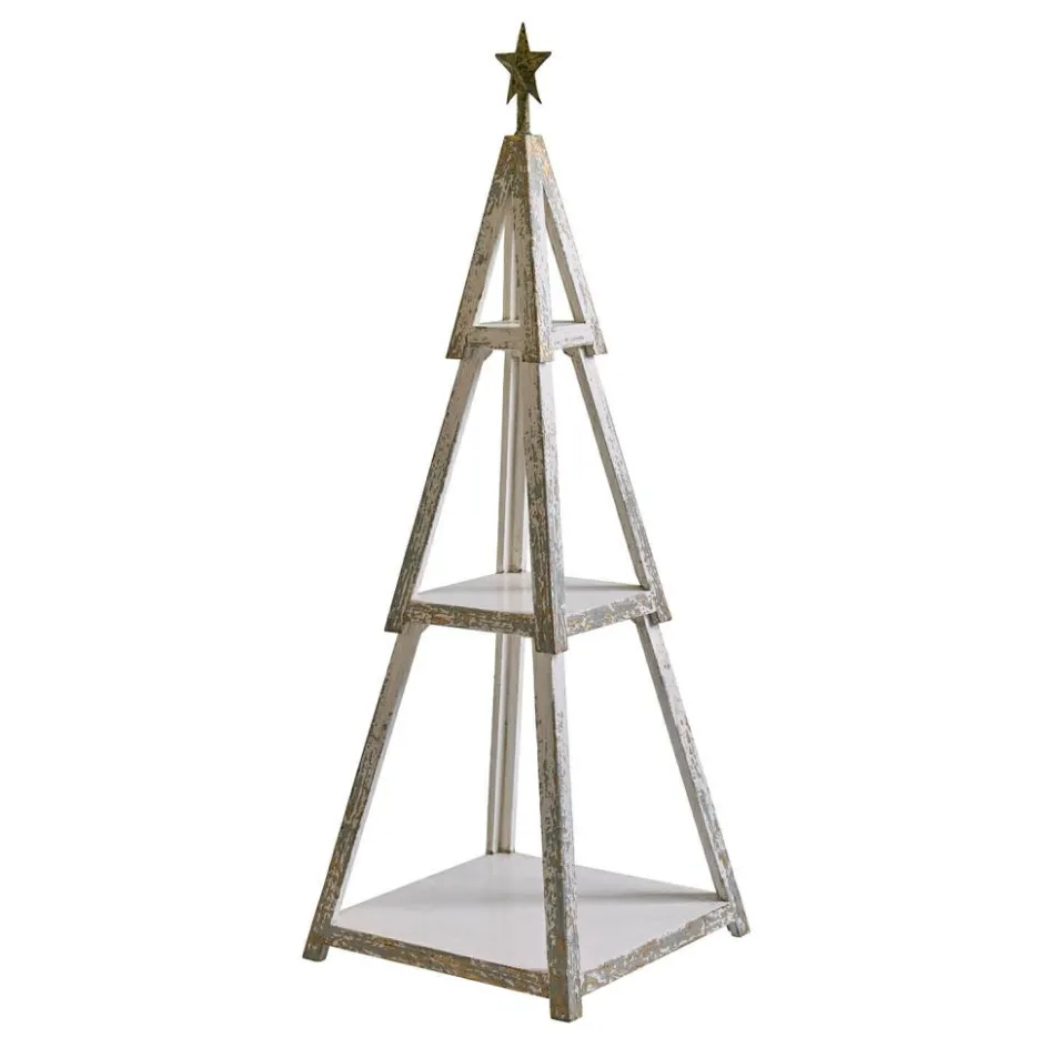 Er erinnert an einen stilisierten Weihnachtsbaum und ist dabei doch so viel mehr: Dieses markante Dekostück vereint rustikales Tannenholz mit einem Antikweiß-Finish, das an verwitterte Landhausmöbel erinnert. Die drei offenen Etagen laden ein, eigene kleine Szenerien zu gestalten – vielleicht mit gläsernen Christbaumkugeln, Kerzenlichtern oder einem Hauch von Natur. Jede Etage wirkt wie eine kleine Bühne für Ihre Lieblingsstücke. Die charmant abgeschliffenen Kanten erzählen vom gelebten Stil vergangener Zeiten, während der goldfarbene Eisenstern an der Spitze einen festlichen Akzent setzt. Ein dekorativer Baum für alle, die das Besondere suchen – ob zur Weihnachtszeit oder als dauerhafte Deko mit kreativem Twist.