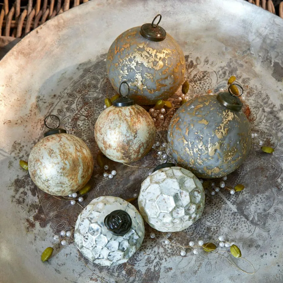 Sechs Kugeln in unterschiedlichen Designs erzählen vom Spiel mit Texturen und Licht: Zwei sind überzogen mit goldenen Äderungen auf rauchigem Grau, zwei strahlen in cremefarbenem Vintage-Look mit zarter Sprenkelung, und zwei zeigen sich in steinartiger Relief-Optik mit charaktervoller Oberfläche. Trotz ihrer Vielfalt wirken die Kugeln wie aus einem Guss – harmonisch aufeinander abgestimmt, mit einem edlen, fast musealen Flair. Sie bringen Tiefe in grüne Tannenzweige, schimmern dezent im Kerzenlicht und fügen sich mühelos in moderne wie klassische Weihnachtskonzepte ein. Ein Set für Liebhaber feiner Details und subtiler Eleganz.