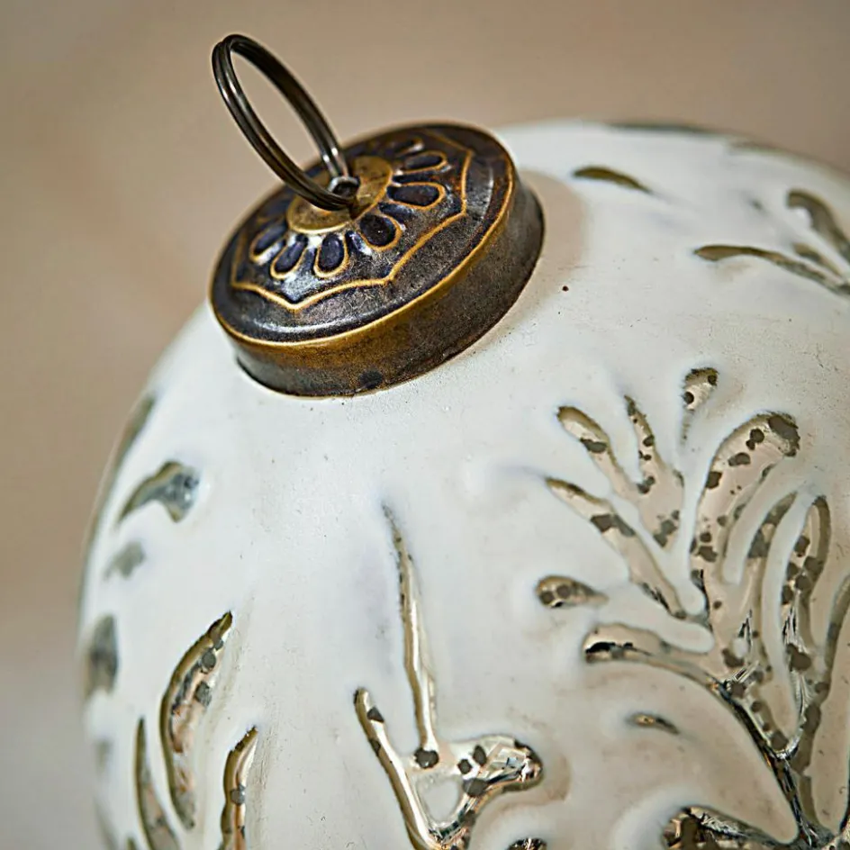 Zauberhafter Weihnachtsschmuck, dem es weder an Exklusivität noch an nostalgischen Werten fehlt. Das Set beinhaltet drei große und eine kleine Glaskugel – jedes Stück ist mundgeblasen und hübsch in Szene gesetzt mit Prägungen in Form von Blüten- und Zweigmotiven, die zusätzlich von silberfarbenem Glanz betont werden. Metallösen aus antikgoldfarbenem Messing vollenden die Unikate. Dekorieren Sie, wie es Ihnen gefällt: Mit edlen Aufhängebändchen aus Samt oder Seide (exkl.) können die Kugeln dekorativ an den Weihnachtsbaum, das Fenster oder einen Ast gehängt werden. In einer Schale präsentiert, schmücken sie auch die Konsole oder den Esstisch auf stimmungsvolle Weise.