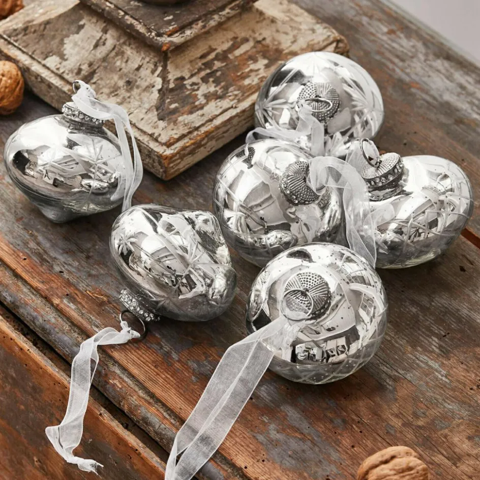 In diesem Set erhalten Sie sechs kleine gläserne Schätze, die eine nostalgische und romantische Weihnachtsstimmung in die Stube zaubern. Die fein geblasenen Modelle aus zartem Glas zieren wunderhübsche Schliffe und ein faszinierendes Bauernsilber-Finish. Am oberen Teil der Aufhängung funkeln kleine Glitzersteine, die im Kerzenlicht edel schimmern. Die Glaskugeln wirken wie Originale aus früheren Zeiten oder wie ein Erbstück der Großeltern, so authentisch sind sie gestaltet. Wer zu Weihnachten ein wenig das Gefühl der guten alten Zeit genießen möchte, trifft damit die richtige Wahl. Auch alle Liebhaber des Shabby-Chic werden sie wunderbar in ihre Festtagsdekoration integrieren können, und das jede Weihnachtssaison aufs Neue. Denn ihr Design ist einfach zeitlos schön.