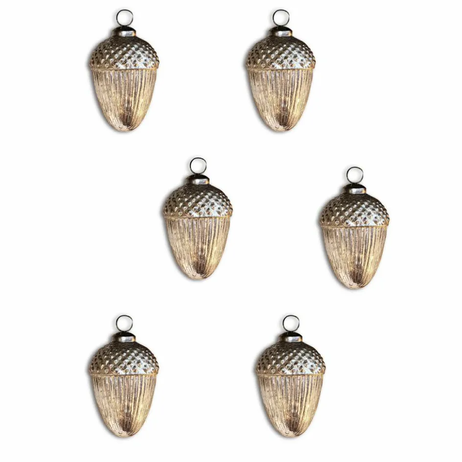 Diese silberne Zapfen im 6er-Set sind das I-Tüpfelchen für Ihren Weihnachtsbaumschmuck. Die nostalgischen Schmuckstücke erinnern in ihrer Form an Eicheln, sind mit zehn Zentimetern aber ein ganzes Stück größer und fallen so im Baum richtig auf. Vor allem, weil sie so schön funkeln: Die nach historischem Vorbild gefertigten Zapfen sind schließlich nach Bauernsilber-Art verspiegelt. Die kunstvoll verarbeiteten Accessoires überzeugen durch liebevolle Details wie die filigranen Verzierungen. Aufgehängt werden die Glaszapfen an kleinen Haken aus Eisen, durch die auch ein Band gezogen werden kann.