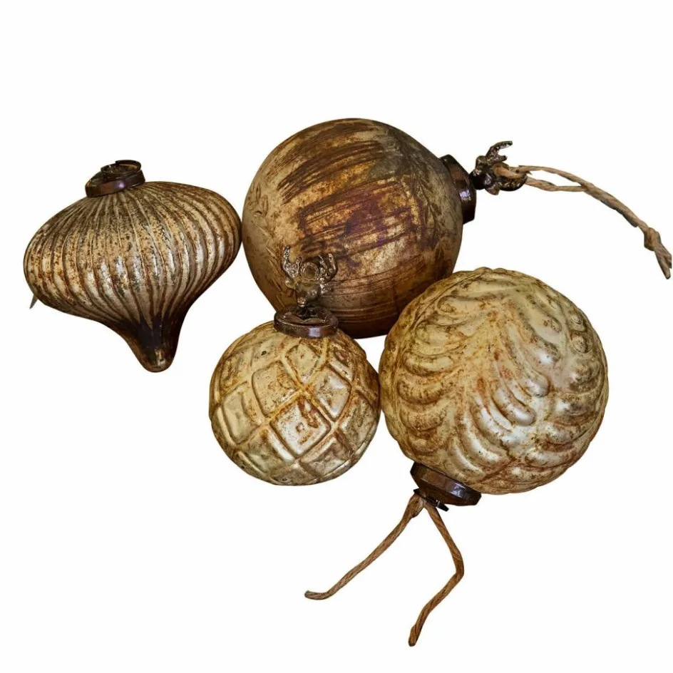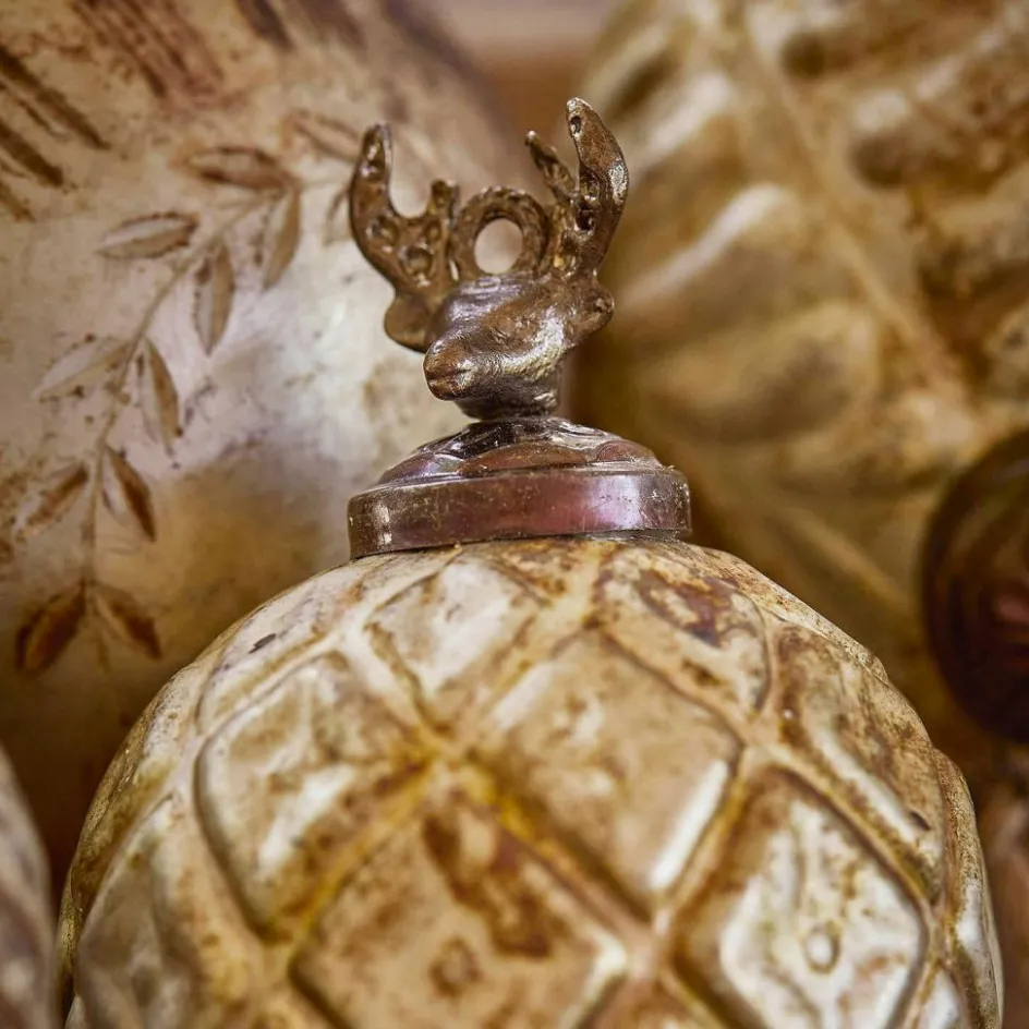 Schaffen Sie eine festliche Atmosphäre mit diesem einzigartigen Weihnachtsbaumkugel-Set. Diese eleganten Schmuckstücke mit nostalgisch schönem Kupferfinish sind ein Muss für Ihren Weihnachtsbaum und werden Ihr Zuhause in ein zauberhaftes Ambiente hüllen. Freuen Sie sich auf vier hochwertige Kugeln in unterschiedlichen Formen und Größen, die alle traditionell von Mund geblasen wurden. Mit ihrem antiken Kupferfinish und den geschliffenen Oberflächen strahlen diese Kugeln eine zeitlose Eleganz aus. Jede Kugel ist ein edles Schmuckstück und verleiht Ihrem Weihnachtsbaum einen ganz besonderen Charakter. Zwei der Kugeln sind mit einem bezaubernden Rentierkopf verziert und werden so zu einem besonderen Eye-Catcher. Aufhängebändchen fügen Sie einfach nach eigenen Vorlieben selbst hinzu, da im Lieferumfang nur die Aufhänger enthalten sind.