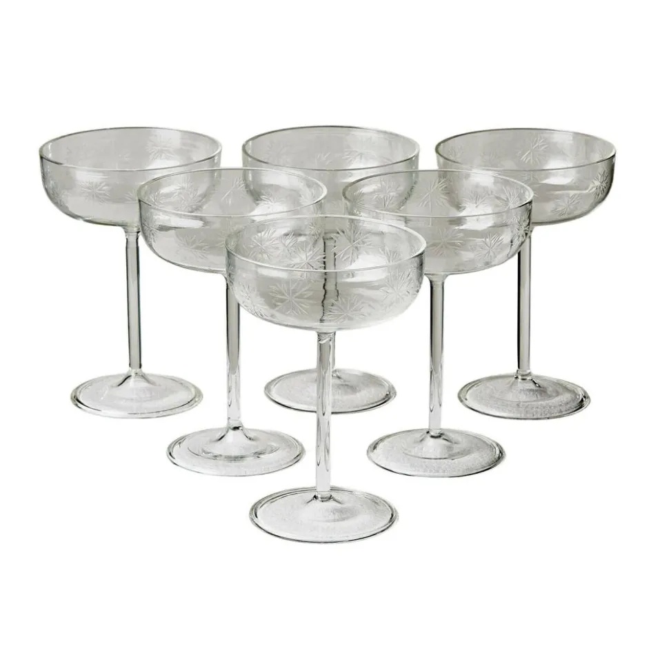 Diese mundgeblasenen Gläser feiern den Winter mit einer Leichtigkeit, die man sehen und spüren kann. In ihrer weichen Coupe-Form schwingen Erinnerungen an elegante Silvesterabende und stimmungsvolle Dinnerpartys mit. Die zarten Gravuren in Form von Schneeflocken sind fein eingearbeitet und wirken wie frostige Kunst auf funkelndem Eis. Ob für prickelnden Champagner, fruchtige Desserts oder als Highlight auf dem gedeckten Tisch – dieses Set vereint nostalgischen Charme mit handwerklicher Finesse. Und da jedes Glas einzeln geblasen ist, trägt jedes seine ganz eigene Handschrift – wie ein stiller Gruß aus einer verschneiten Winternacht.