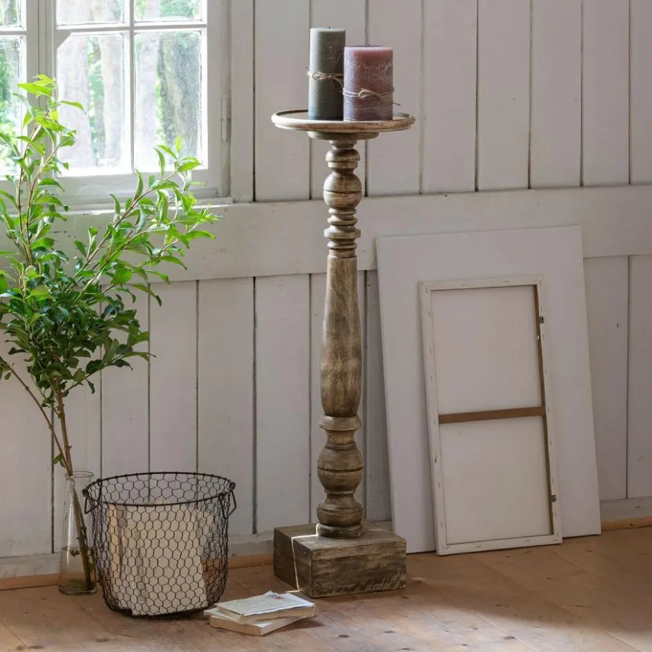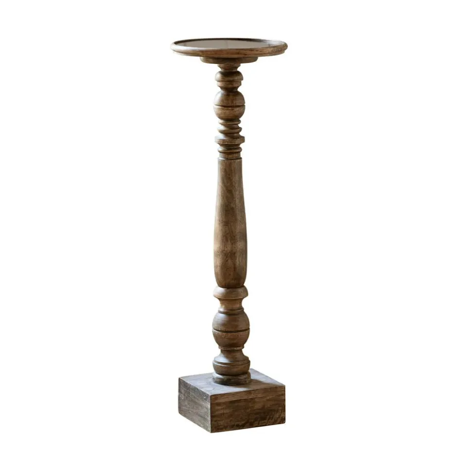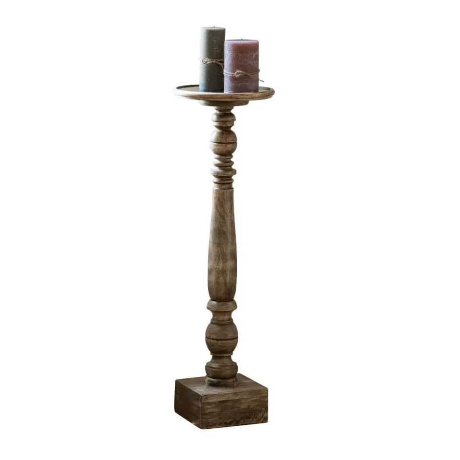 Dieser Kerzenständer gleicht einem stillen Wächter der Gemütlichkeit: Gefertigt aus Mangoholz mit wunderbar griffiger Struktur, erhebt sich sein schlanker, detailreich gedrechselter Fuß auf einem quadratischen Sockel. Die runde Ablagefläche bildet mit ihrem tiefschwarzen Finish einen spannenden Kontrast zum warmen Holzton – eine Bühne, wie gemacht für eine große Kerze, eine Blumenvase oder ein stimmungsvolles Arrangement. Durch seine Höhe und schlanke Silhouette lässt er sich vielseitig inszenieren – als dekorativer Solist im Flur, stilvoller Blickfang neben dem Sofa oder als charmante Ablage in Leseecken.