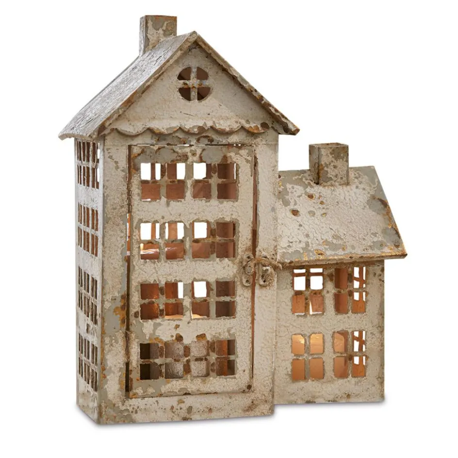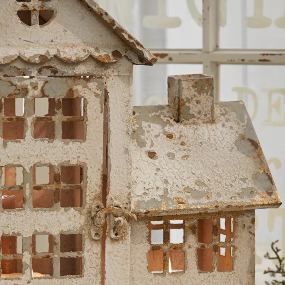 Die handgearbeiteten Details dieser außergewöhnlichen Shabby-Laterne aus Eisen zeugen von einem hohen Qualitätsanspruch. Die wunderschönen Schrägdächer, Schornsteine, Wände und Fensterrahmen sind von einem hellen Antik-Finish überzogen, das in mehreren Schichten appliziert wurde. So entstand eine prächtige Patina, mit gewollten Abnutzungserscheinungen. Für einen authentischen Antik-Charakter ist also gesorgt. Die Laterne ist selbstverständlich mit einem Türchen ausgestattet, damit sie ganz einfach mit Kerzen, Teelichtern oder LED-Lichterketten bestückt werden kann. Ein wirklich toller Lichtspender und eine noch bessere Deko-Idee!