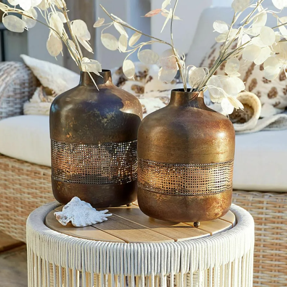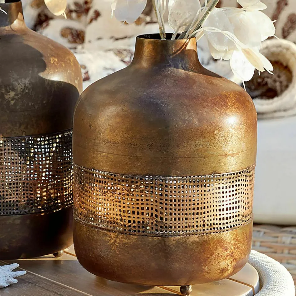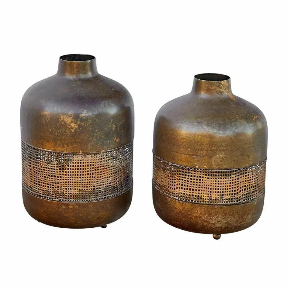Die Windlichter im Set bestechen durch ihre raffinierte Verarbeitung und den charmanten Antik-Look. Die goldene Patina verleiht dem Design eine zeitlose Ausstrahlung, die Wärme und Gemütlichkeit ausstrahlt. Die durchbrochene Struktur in der Mitte sorgt für ein faszinierendes Lichtspiel, während das Kerzenlicht durch die filigranen Muster strahlt. Das clevere Design ermöglicht ein einfaches Einsetzen der Kerzen von unten, wodurch das Handling besonders unkompliziert wird. Ob im Wohnraum, auf der Terrasse oder als besonderes Highlight im Esszimmer – diese Windlichter sind ein wahres Schmuckstück für jedes Zuhause.