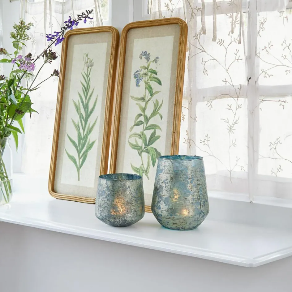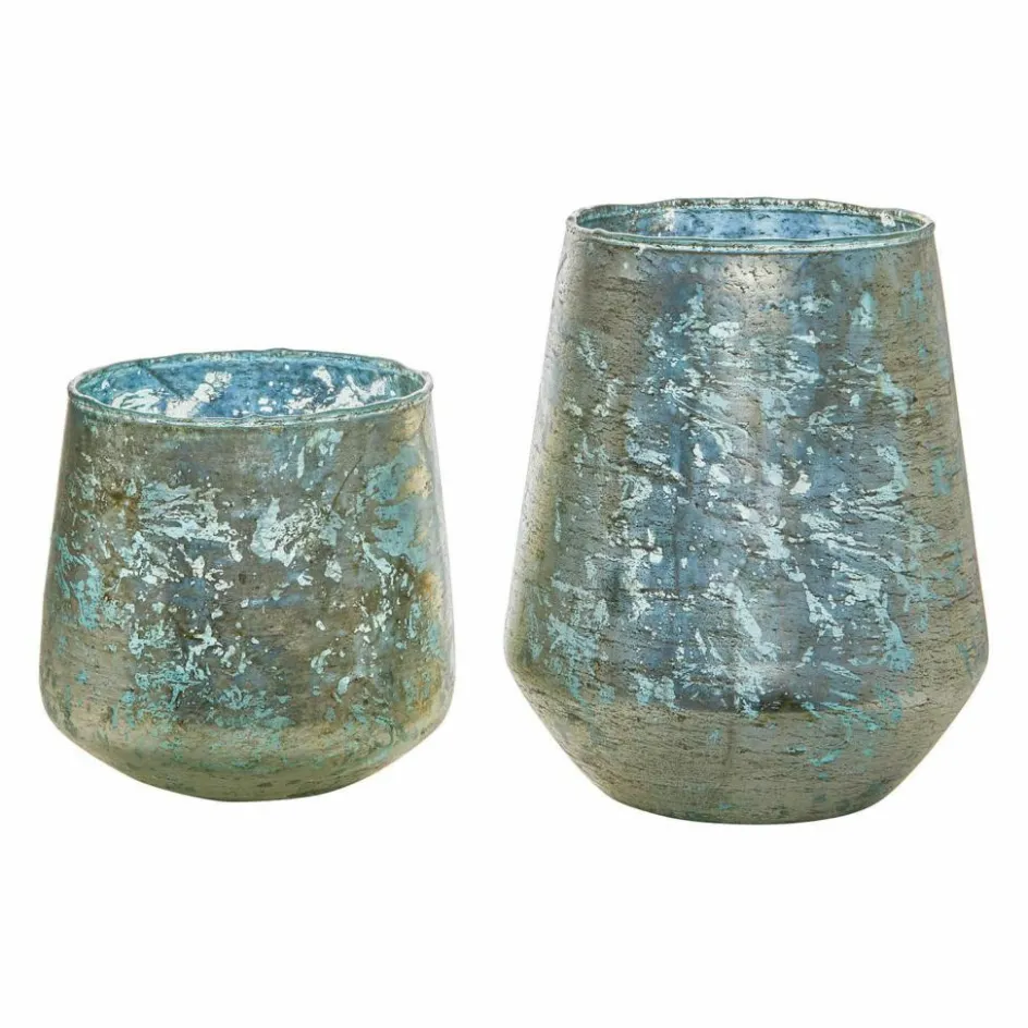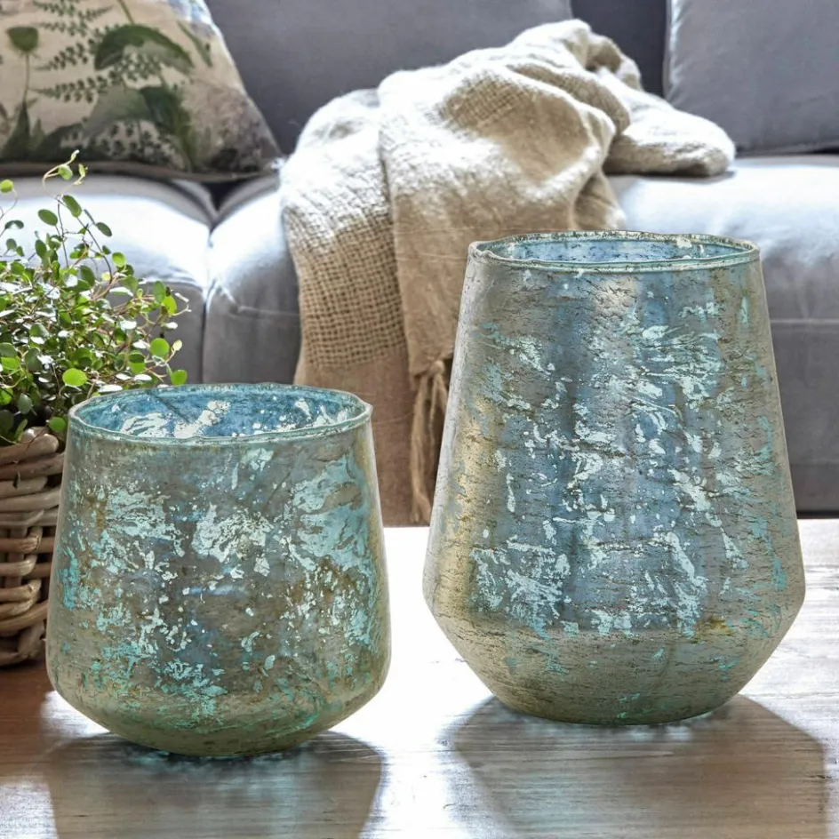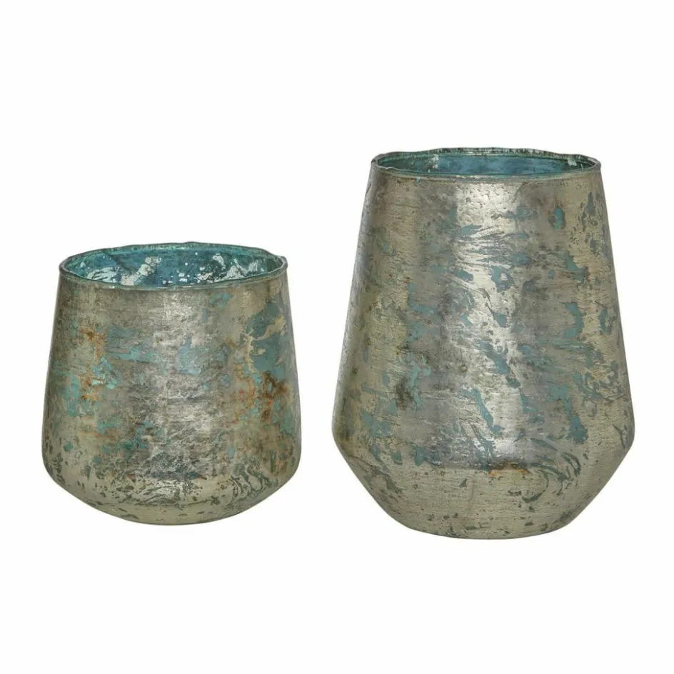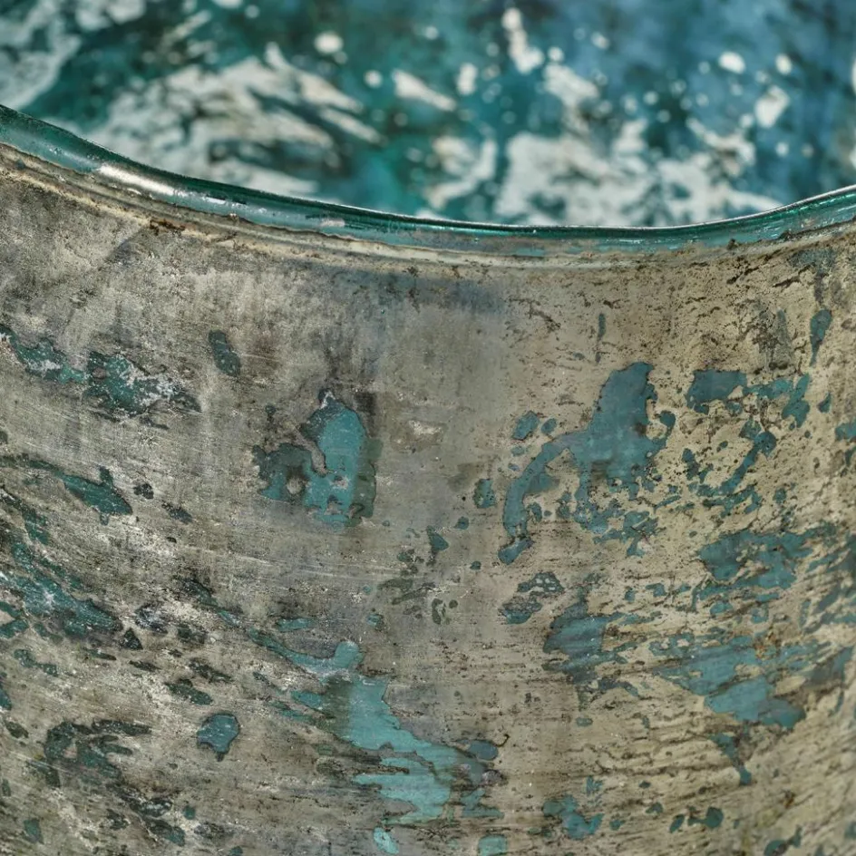 Zartes Antikblau im zauberhaften Duett mit einem antiken Goldton – eine stimmungsvolle Komposition, die uns zu jeder Jahreszeit begeistert. Denn das zarte Bleu, das an den Morgenhimmel im Frühling und Sommer erinnert, wird ergänzt von einem warm schimmernden Goldton, der das Windlicht-Set zu einem Accessoire macht, das auch in der eleganten Weihnachtsdeko einen festen Platz einnehmen kann. Zu der besonderen Anziehungskraft der beiden Windlichter trägt auch das Wissen bei, dass die raue Oberfläche des schweren Glases sorgfältig von Hand mit dem goldenen Farbton foliert wurde, so dass – wie es bei Handarbeit zu erwarten ist – kein Windlicht dem anderen hundertprozentig gleicht. Sie erhalten das Windlicht 2er Set in zwei sich wunderschön ergänzenden Größen und ohne Kerzen, so dass Sie mit verschiedenen Kerzenfarben experimentieren können.