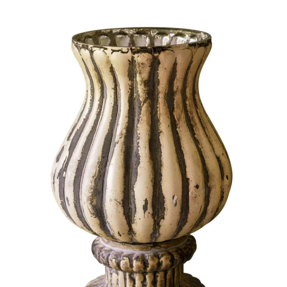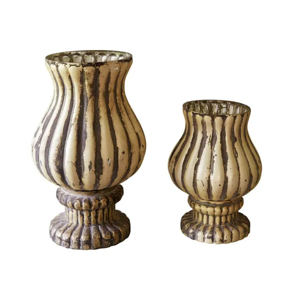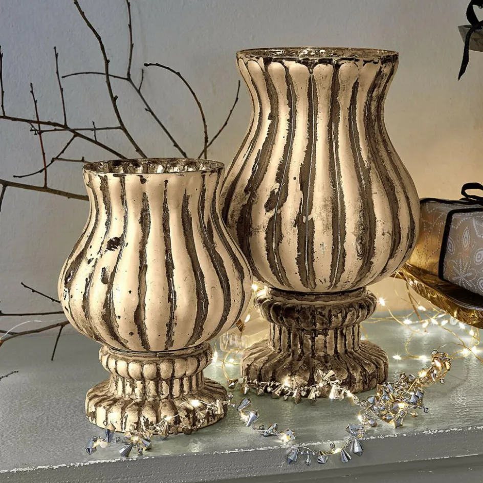 Manchmal reicht ein Licht, um eine Stimmung vollkommen zu verändern – und diese beiden Windlichter beherrschen genau das. Ihre bauchige Silhouette mit den sanft eingearbeiteten Rillen erinnert an historische Glasobjekte, während das matte Antik-Finish ihnen eine gelebte Patina verleiht. Im Inneren offenbart sich eine spiegelnde Oberfläche, die jeden Flammentanz vervielfacht und für ein magisch warmes Leuchten sorgt. Ob auf der Festtafel, dem Kaminsims oder im Fenster – dieses Set schenkt jeder Ecke das gewisse Strahlen.
