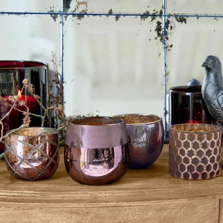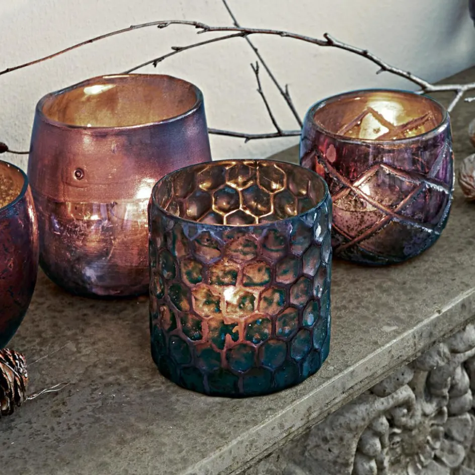 Die Schmuckstücke in der grünlich irisierenden Farbpalette sind ein absoluter Blickfang. Das Set besteht aus vier Glas-Windlichtern, doch jedes von ihnen ist einzigartig. Die Gläser zeigen sich in spektakulären Farbnuancen mit Unikat-Charakter. Wobei sich auch das Oberflächen-Design auffallend unterscheidet. Handwerklich gekonnt zeigen sich hier verschiedene Gravur-Techniken, wie etwa der Waben- und der Rautenschliff. Zudem sind die faszinierenden Farbtöne sowohl glänzend als auch matt aufgebracht. Dadurch entstehen ebenfalls faszinierende Kontraste in der Gesamt-Optik. Wobei der versilberte Untergrund zusätzlich reizvolle Kontraste schafft. Die eleganten Windlichter aus Glas sind stimmungsvolle Deko-Accessoires. Mit klassischen Teelichten hell erleuchtet, zaubern sie eine feine Stimmung. Und sollten Sie einmal keine Teelichte bei der Hand haben – kein Problem. Die irisierenden Glasfarben funkeln Ihnen in jedem Fall entgegen.