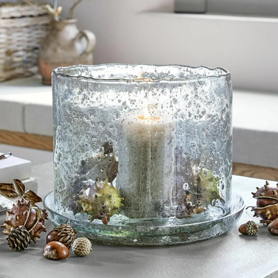 Sie lieben Kerzenschein? Dann ist dieses edle Windlicht ein Must Have. Es besteht aus dickem Glas, in welches fein eingearbeitete Farb-Elemente eingelassen sind. Das sorgt für eine interessante Struktur, und der gewellte Rand ist eine weitere Besonderheit dieses Designs. Freuen Sie sich auf reizvolle Lichtspiele bei gemütlicher Illumination und zelebrieren Sie entspannte Momente zu Hause. Ob beim Filmeabend, dem Schaumbad oder für das romantische Candlelight Dinner, mit warmem Licht wird es gleich noch heimeliger. Vor allem wenn es dunkel oder grau ist, kann man sich so noch viel besser einkuscheln. Wer möchte, könnte in dem gläsernen Accessoire auch dekorative Arrangements schaffen, etwa mit einem Potpourri oder Glitzersand und Muscheln. Und auch zur Aufbewahrung kleiner Dinge wie Knöpfe, Münzen und Haarnadeln bietet es sich an – vielseitig und ausgesprochen elegant, einfach ein wahres Lieblingsstück.