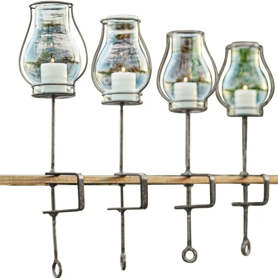 Diese wunderhübschen Windlichter haben eine raffinierte Besonderheit: Dank einer Schraubzwinge lassen sie sich wunderbar an einer Tischkante oder an anderer geeigneter Stelle festmachen. Das Gestell aus Eisen krönen filigrane Aufsätze aus Glas, in denen Sie Teelichte entzünden können. Freuen Sie sich in lauen Sommernächten über romantischen Kerzenschein und schmücken Sie Ihren Lieblingsort im Freien mit diesem klassisch eleganten Quartett. Eine Prise Vintage-Charme umspielt die vier kunstvollen Designs.