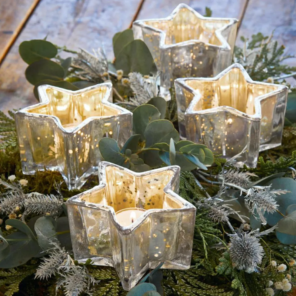 Die gläsernen Windlichter im 4er Set punkten mit einer schlichten Sternenform und einem silberfarbenem Finish. Der Clou: An der Unterseite befindet sich jeweils ein Dorn – zum schnellen und einfachen Befestigen auf einem Adventskranz. Das Ergebnis ist ein edler und zugleich moderner Look, der auch Ihr Zuhause ganz wunderbar weihnachtlich dekoriert. Die dickwandigen Kerzenhalter sind hochwertig gearbeitet und für Teelichter geeignet.