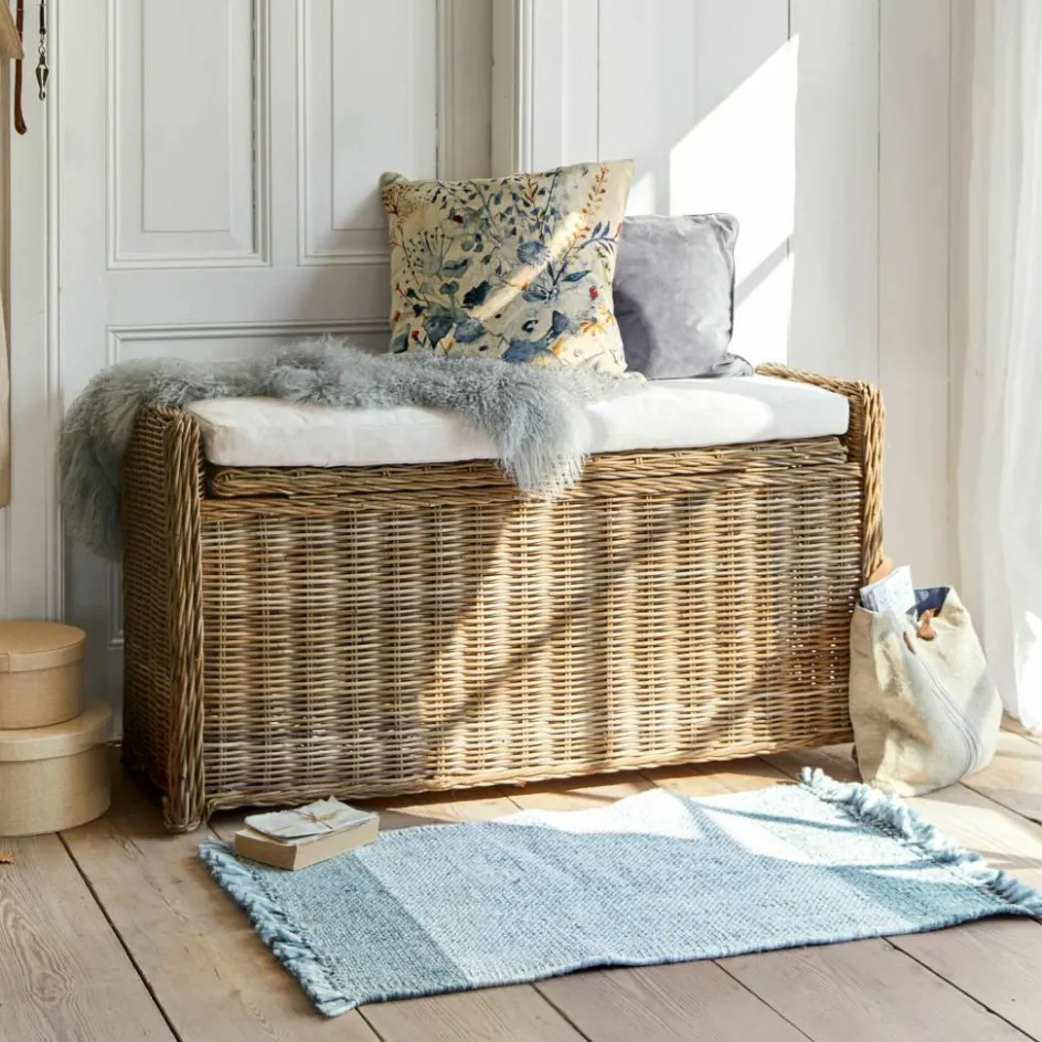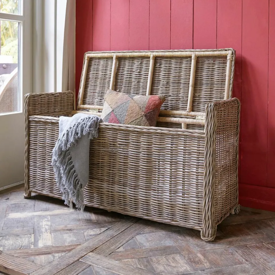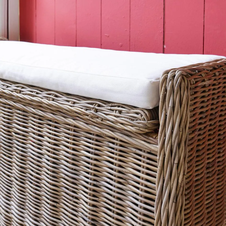 Naturnaher Luxus mit sehr viel Charme. Hier erhalten Sie ein klassisches Schmuckstück, das kunstvoll aus natürlichem Rattan geflochten ist. Dieses Naturmaterial alleine sorgt für viel Stabilität durch eine feste und doch charmante Flechtung. Die zeitlose Sitzbank überzeugt darüber hinaus mit besonderer Raffinesse, denn der Deckel lässt sich aufklappen, sodass Sie darauf nicht nur komfortabel sitzen, sondern auch allerlei Dinge ordentlich darin verstauen können. Ein echtes Multitalent. Mit einem hübschem Sitzkissen versehen wird es noch gemütlicher. So ist es immer aufgeräumt, und Kissen, Bezüge, Spielzeug, Hunde-Accessoires, Plaids, Decken und vieles mehr finden darin ein Plätzchen. Zudem lässt die elegante Sitzbank sich ausgesprochen vielseitig nutzen – als gemütlicher Fenstersitz, am Fußende des Bettes platziert, im Flur oder Wohnzimmer, hiermit beweisen Sie immer Geschmack. Das hochwertige und naturnahe Design passt vorzüglich zu Country-Stil und Landhaus-Look und verschönert jeden Raum. Dank der handlichen Größe passt die Bank auch in kleinere Zimmer. Dieses geschmackvolle Design wird Ihnen lange Freude machen.