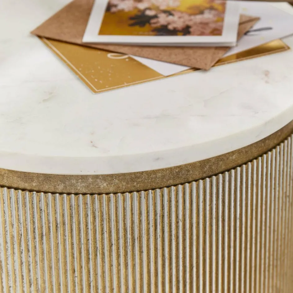 Ein Möbelstück wie ein Statement: Dieses 2-teilige Beistelltisch-Set bringt Leichtigkeit und Substanz auf kunstvolle Weise in Einklang. Der kleinere Tisch besitzt eine einzigartige Marmorplatte, die durch ihre feine Maserung jedes Stück zum Unikat macht. Der größere Tisch bezaubert mit einer getönten Glasplatte und einem offenen Gestell, unter das der kleinere Tisch einfach verschwindet. Das verwendete Eisen erstrahlt dabei in einem edlen Antikgold-Finish. Ob nebeneinander arrangiert oder einzeln platziert – dieses Set ist mehr als nur Ablagefläche. Es ist ein Designobjekt, das sich jeder Umgebung stilvoll anpasst und dennoch selbstbewusst wirkt.