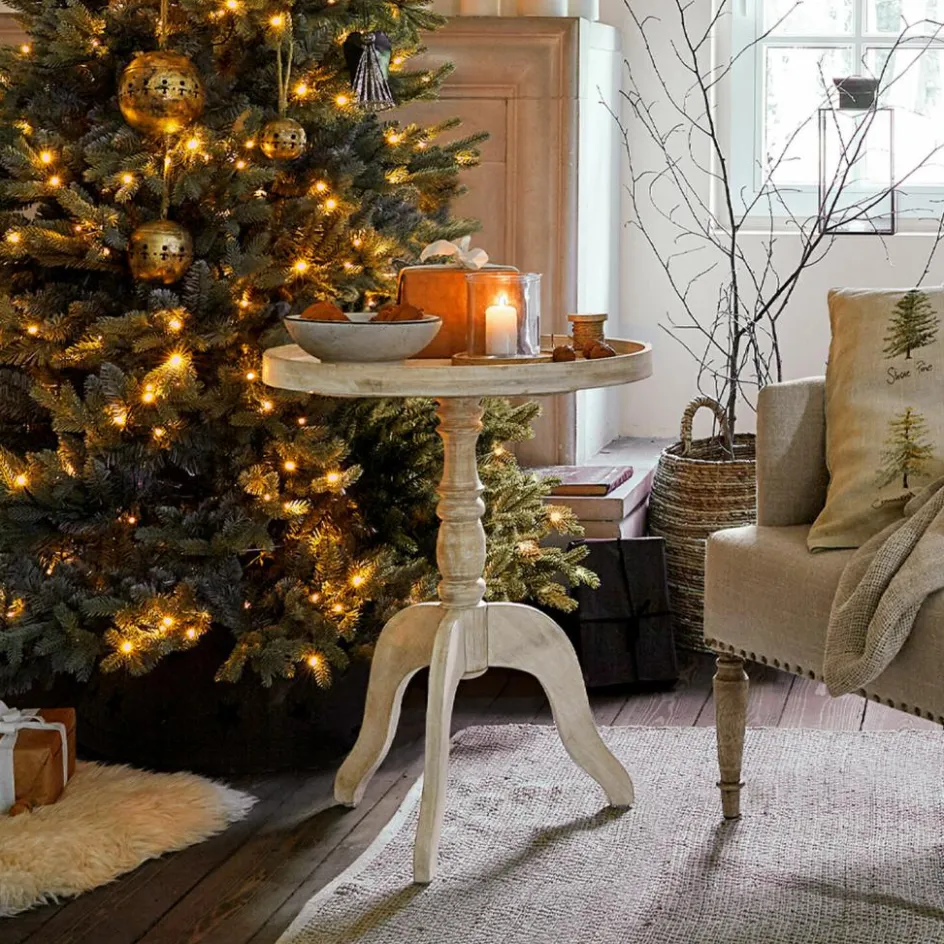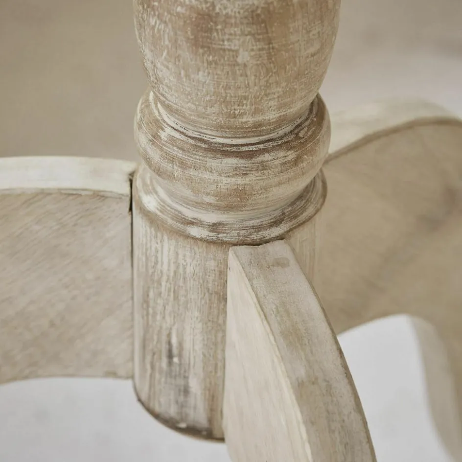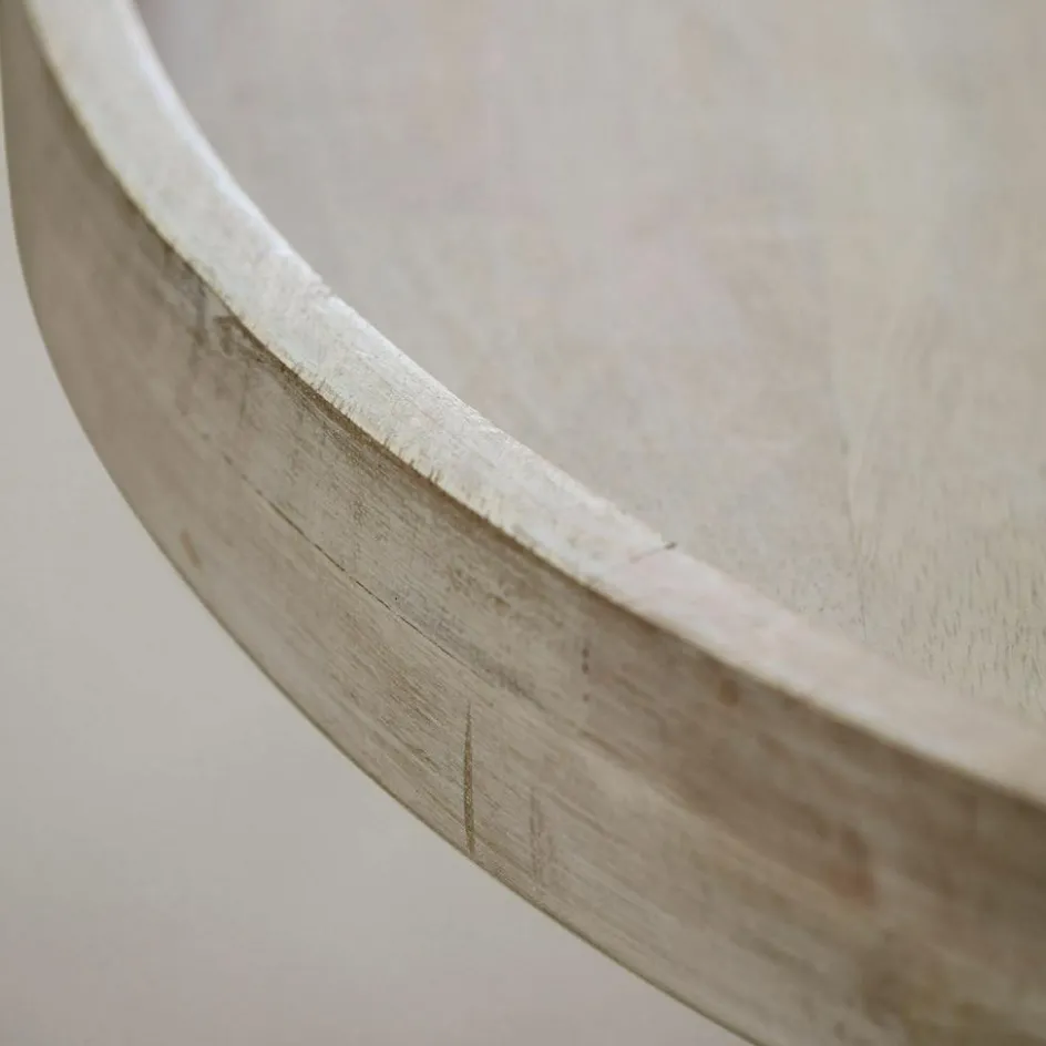Dieser sehr schöne Beistelltisch besteht aus wertvollem Mangoholz mit hübschem White-Washed-Finish. Dadurch erhält er eine nostalgische Patina. Der Rand ist erhöht gearbeitet, sodass nichts einfach herunterrutschen kann. Die formschönen Füße sind handgedrechselt und geben ihm eine besonders attraktive Optik. Das elegante Design eignet sich ideal als zusätzliche Ablagemöglichkeit für Snacks, Teller oder Gläser, und bietet auch für Gäste einige Möglichkeiten. Sie können hierauf auch wunderbar Dekoratives arrangieren, etwa Blumen, Windlichter und andere Lieblingsstücke. Das handliche und sehr ansprechende Design adelt wirklich jeden Raum charmant.