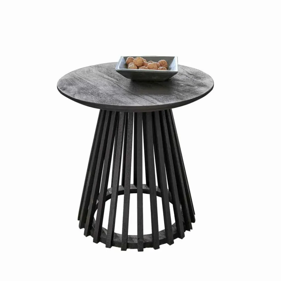 Dieser Beistelltisch ist ein echtes Statement-Piece. Die Kombination aus runder Tischplatte und skulpturalem Gestell verleiht ihm eine außergewöhnliche Präsenz. Das dunkle Holz mit seiner feinen Maserung bringt Tiefe und Wärme in den Raum, während die filigranen, aber stabilen Streben für eine luftige Leichtigkeit sorgen. Ob als Ablage neben dem Sofa, als dekorativer Akzent im Eingangsbereich oder als Nachttisch – dieses Möbelstück überzeugt durch seine Vielseitigkeit und seine ausdrucksstarke Formensprache.