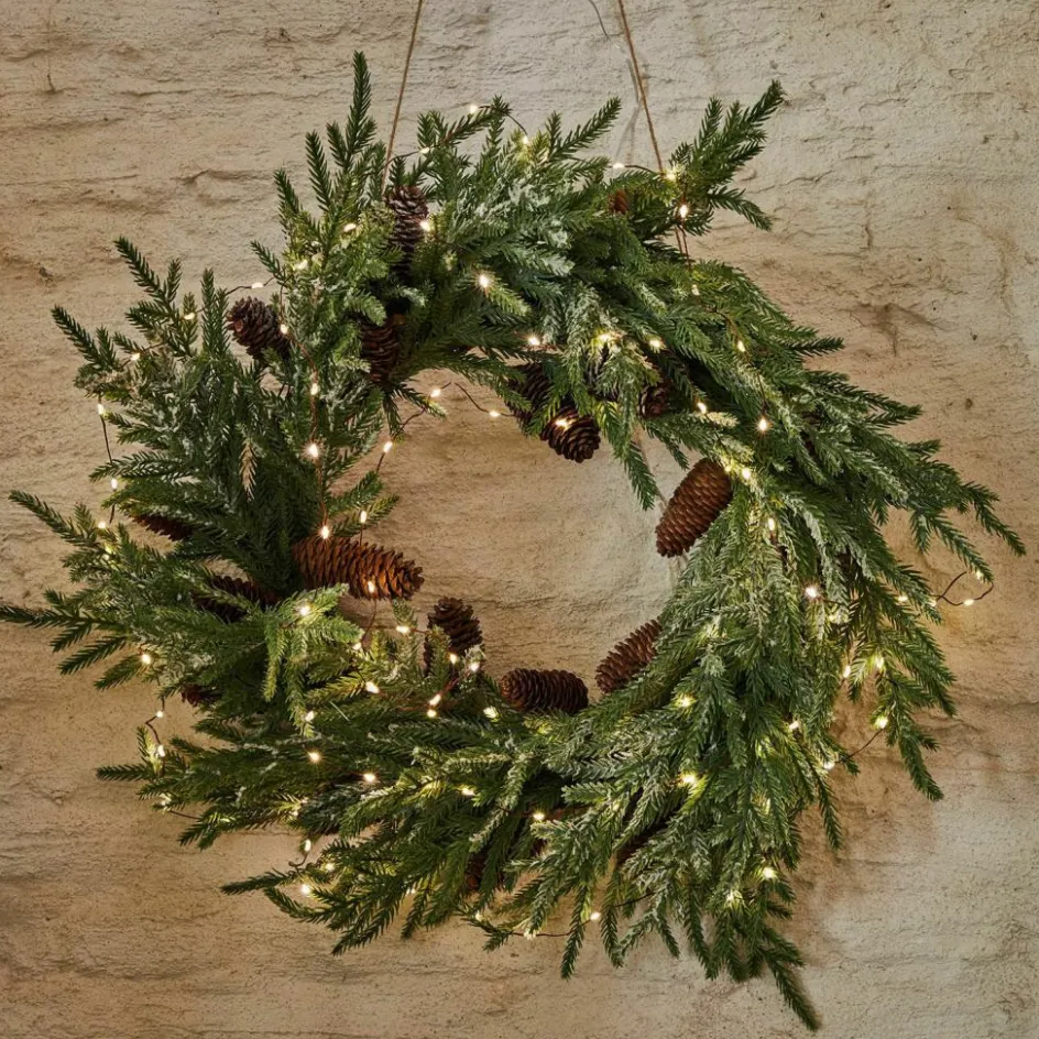 Ein Kranz wie aus dem Wald gezaubert: Dieser prachtvolle Winterkranz beeindruckt durch sein naturgetreues Design und hochwertige Materialien. Das Besondere ist die Rückseite aus echten Kiefernzweigen, die dem Kranz nicht nur Stabilität, sondern auch eine authentische Optik verleihen. Dichte, grüne Nadeln, teilweise mit frostigem Finish versehen, treffen auf echte Tannenzapfen, die sich harmonisch ins Gesamtbild einfügen. Ein zarter LED-Draht mit 100 warmweißen Lichtern umschmeichelt das Arrangement und lässt es in zauberhaftem Glanz erstrahlen – als wären kleine Lichtpunkte vom Himmel gefallen. Ob an der Haustür, auf dem Sideboard oder am Fenster – dieser Kranz bringt winterlichen Zauber in jedes Ambiente und trotzt dabei Wind und Wetter.
