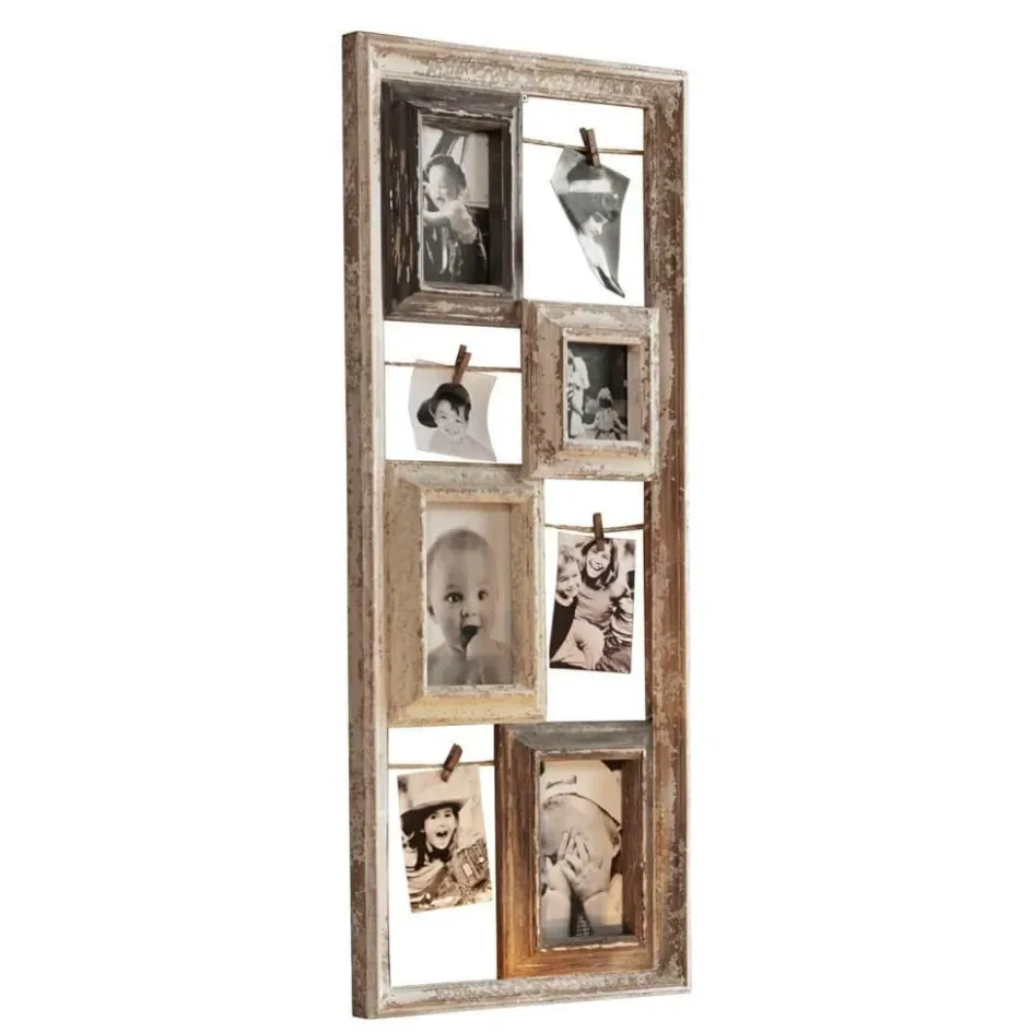 Dieser Bilderrahmen bietet Platz für mindestens acht Bilder: In den vier unterschiedlich gestalteten Rahmen oder mit einer Klammer an einer Schnur zu befestigen. Der Stil dieser Wanddekoration passt toll zu einer Einrichtung im Landhaus- oder Shabby-Chic. Sogar ganz ohne Inhalt ist der Bilderrahmen aus Holz ein echter Blickfang und ein Kunstwerk für sich. Der charmante Vintage-Look der Rahmen liegt voll im Trend.