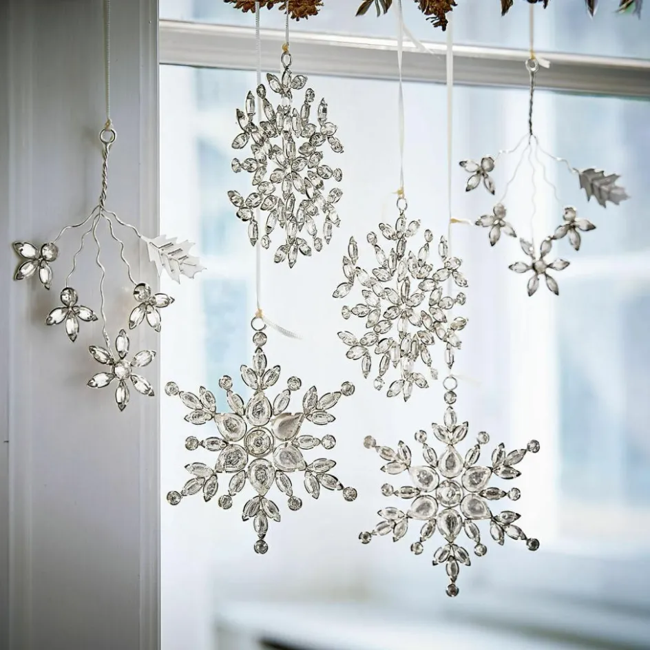 Die Anhänger in diesem sechsteiligen Weihnachtsschmuck-Set ähneln glitzernden Schätzen aus dem Winterwunderland. Die glamourösen Winter-Accessoires sind aus hochwertigem Eisen gefertigt und mit funkelnden Glasperlen bestückt. Das lässt sie im Sonnen- oder Kerzenlicht ganz herrlich funkeln. Die unterschiedlichen Motive sorgen für ein festliches Ambiente zu den Feiertagen: Da hätten wir Schneeflocken, kleine Sterne und auch filigran geformte Blätter. Dieses traumhaft schöne Set verleiht Ihrem Zuhause einen einzigartigen Glanz und veredelt Ihre Festtagsdekoration auf eindrucksvolle Weise. Veredeln Sie Ihren Weihnachtsbaum oder nutzen Sie die stilvollen Schmuckstücke, um Geschenke für Ihre Liebsten zu verschönern.