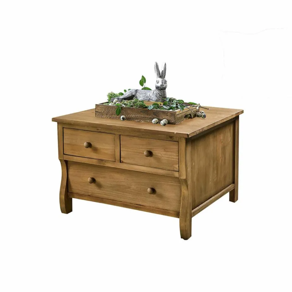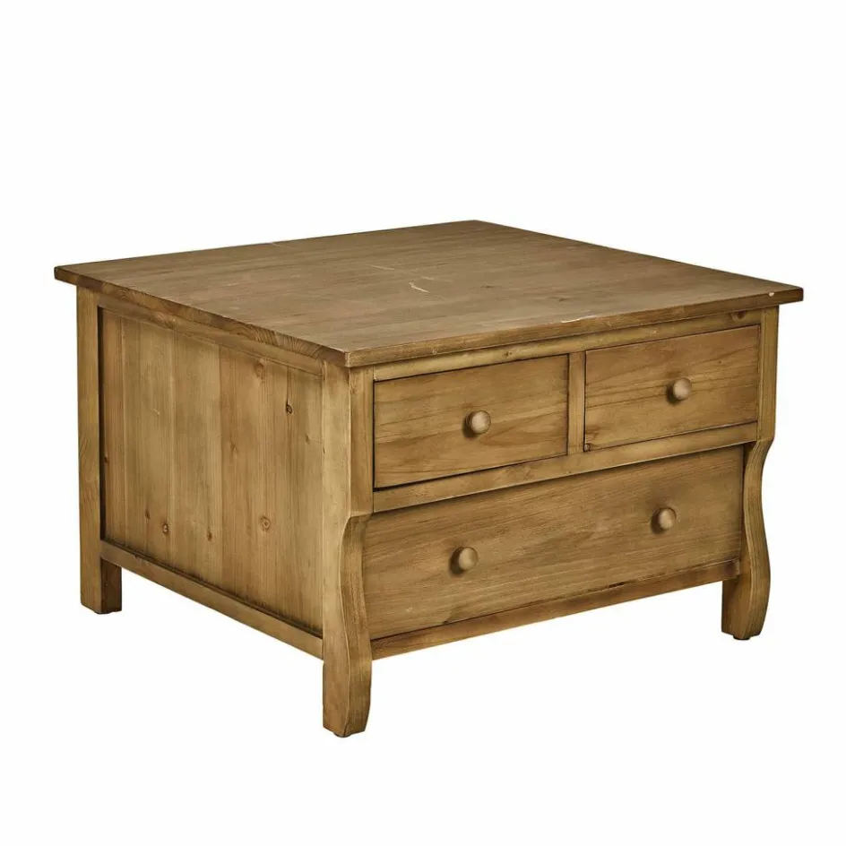 Ein außergewöhnlicher Couchtisch, der nostalgisch inspiriert ist und gleichzeitig als Kommode fungiert. Denn er bietet Raum für drei große Schubfächer, in denen sich einiges verstauen lässt. Die Seiten sind in Kassetten-Manier von Holzleisten gerahmt, während die schön geschwungenen Holzbeine einen festen Stand garantieren. Für den Shabby-Chic darf das antike Oberflächen-Finish nicht fehlen – gerade die unvollendete Schönheit mit authentischen Abnutzungsspuren macht diesen Tisch im ländlichen Stil so besonders. Die Qualität der handwerklichen Arbeit und der Korpus aus massivem Kiefernholz garantieren eine hohe Stabilität und Langlebigkeit. So werden Sie lange Freude an diesem einzigartigen Möbelstück haben.