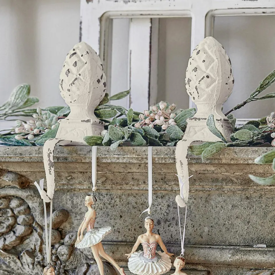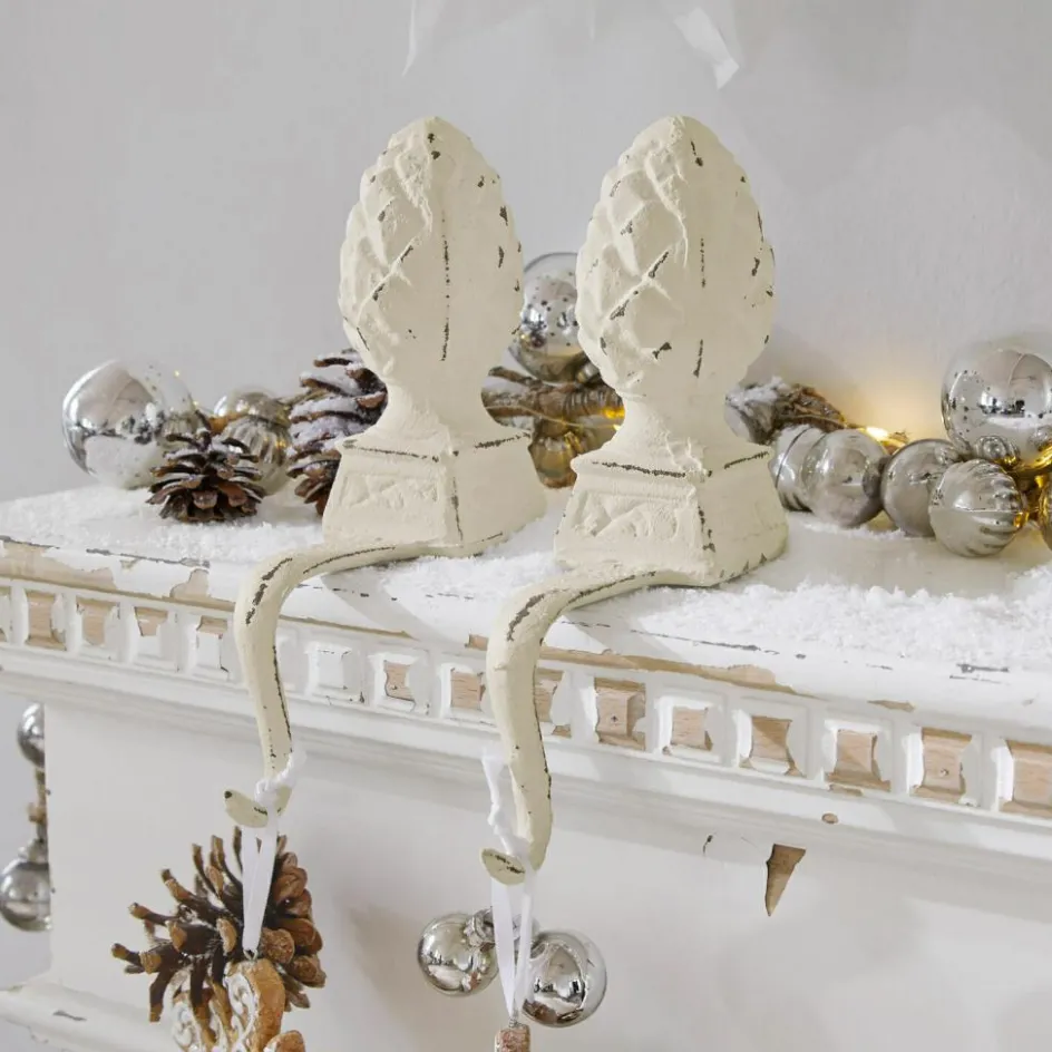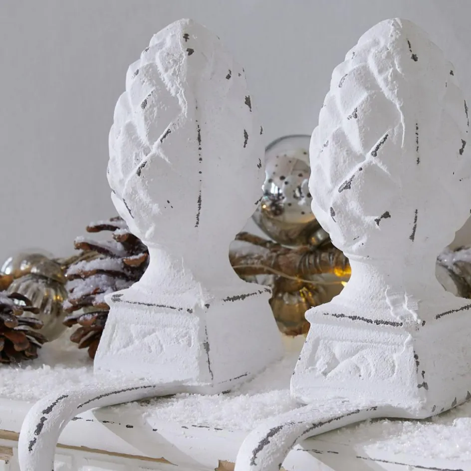 Das 2er Set besteht aus eisernen Pinienzapfen im Antik-Look, jeweils mit einem über eine Kante laufenden, praktischen Haken versehen. Unser Tipp: Dekorieren Sie die eisernen Schwergewichte auf dem Kaminsims, einer Kommode oder jeweils an den Seiten eines halbhohen Schrankes oder Regals. An den Haken können Sie dann beispielsweise einen Weihnachtsstrumpf, einen hübschen Strauß Trockenblumen oder auch Ihr Schlüsselbund aufhängen. Reicht das Gegengewicht der Zapfen aus Gusseisen nicht mehr aus um das Anhängsel zu tragen, können Sie die Haken auch ganz einfach mit einem Nagel oder einer Schraube an ihrem Platz befestigen. Das Tolle an diesen massiven Kunstwerken: Selbst ohne tragende Rolle haben die beiden ihre Daseinsberechtigung, denn sie sind einfach ein toller Hingucker.