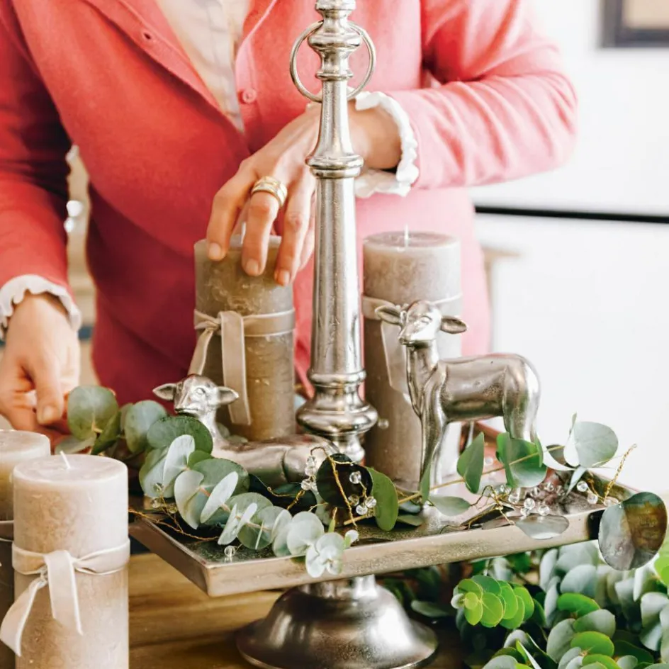 Sie wünschen sich einen luxuriösen und sehr ästhetischen Schmuck zu Ostern, der schon perfekt kombiniert zu Ihnen kommt? Dann ist dieses große und sehr harmonische Set die beste Wahl. Es besteht aus einer stilvollen Etagere, zwei niedlichen Osterlämmchen, einer sehr naturnahen Girlande sowie feinen Kerzen. All diese Schmuckstücke lassen sich wunderbar zusammen auf der Etagere arrangieren. Diese hat viel Vintage-Charme und besteht aus Aluguss mit Antik-Finish. Sie ist auch nach Ostern noch lange einsetzbar, etwa um Dekoratives oder kleine Leckereien darauf zu präsentieren. Beide Lämmchen aus Aluguss glänzen und sind in zwei Designs gefertigt. Die Kerzen sorgen für ein gemütliches Licht, sie sind von Hand gefertigt und ansprechend durchgefärbt. Und die Girlande ist sehr natürlich Magnolienblättern nachempfunden sowie in Handarbeit gefertigt und bemalt. Mit ihrem dünnen Eisendraht können Sie sie leicht formen und nach Wunsch drapieren. Nun ist es an Ihnen, all diese Lieblingsstücke auf der Etagere zu dekorieren – und schon können Sie sich auf einen individuellen und sehr charmanten Tischschmuck zum Osterfest freuen. Alle Teile des Sets können Sie natürlich auch einzeln oder mit anderem Schmuck arrangieren und so Ihr ganz persönliches Osterfest zelebrieren. Das Set besteht aus Etagere (12035), Kerze 4er Set (19679), Deko-Lamm 2er Set (20277) und Girlande (20129).