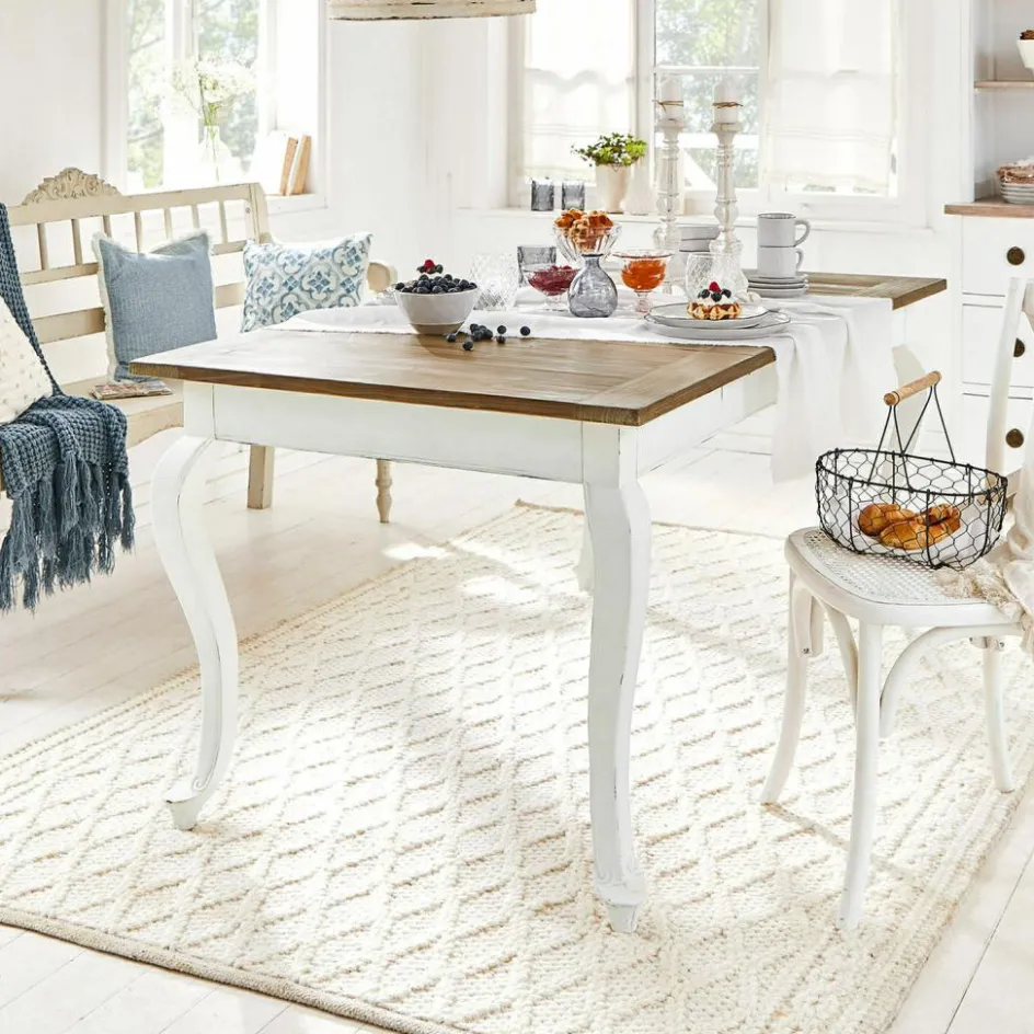 Dieser luxuriöse und sehr charmante Tisch ist wirklich ein Schmuckstück im nostalgischen Stil. Er hat reizende, anmutig geschwungene Beine und eine sehr ansprechende Zweifarbigkeit. Die Tischplatte besteht aus naturbelassenem Tannenholz, das Gestell ist aus lackiertem Pappelholz schwungvoll gestaltet und mit einem schönen Antik-Finish veredelt. Die flexibel ausziehbare Tischplatte bietet eine Größe von 90 bis 160 Zentimetern – ideal allein, zu zweit oder auch wenn Gäste kommen. In der Küche oder als Esstisch im Wohnzimmer leistet dieser edle Tisch allerbeste Dienste, und er ziert ein Ambiente im Shabby-Chic harmonisch. Sie könnten ihn auch als Arbeitstisch im Home Office oder als Lieblingsplatz zum Zeichnen und Schreiben nutzen – dieser elegante Tisch ist einfach immer perfekt und zudem wirklich eine Augenweide.