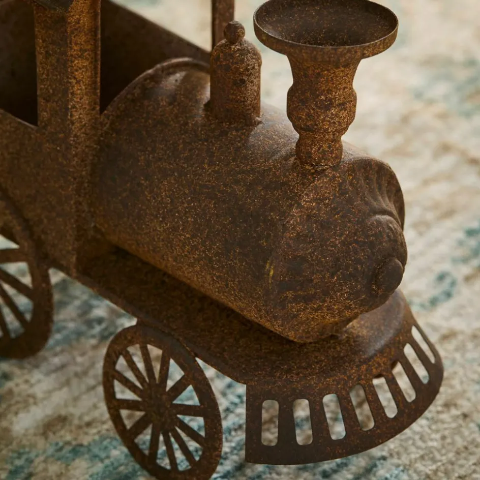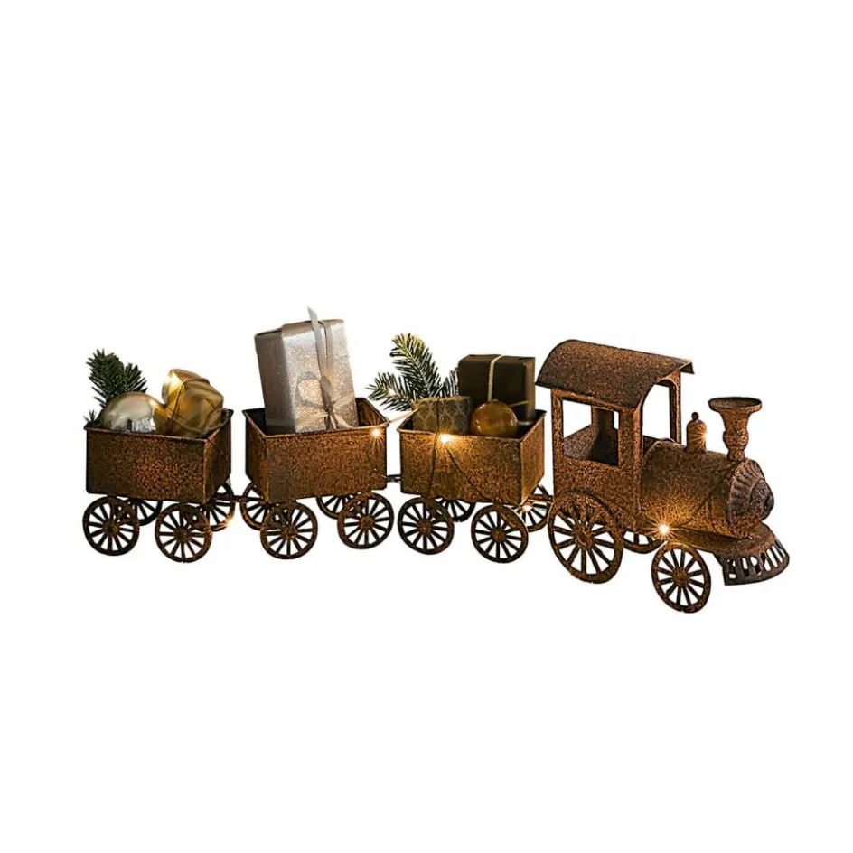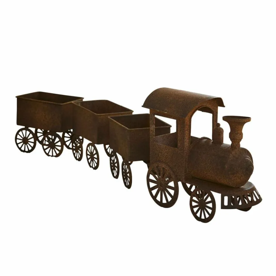 Erwecken Sie eine vergangene Ära zum Leben mit diesem entzückenden Set, bestehend aus einer nostalgischen Lokomotive und drei passenden Zugwaggons. Dieses faszinierende Ensemble, das wie ein antiker Dachbodenfund anmutet, ist aus robustem Eisen handgefertigt und qualitätsvoll mit einem antiken Rost-Finish versehen. Obwohl dieses Set an das traditionelle Spielzeug unserer Vorfahren erinnert, handelt es sich tatsächlich um ein exklusives Dekorationsobjekt, das nicht unbedingt für Kinderhände bestimmt ist. Es verkörpert ein authentisches Vintage-Ambiente, das eine einzigartige Atmosphäre in jedem Raum schafft. Unser Vorschlag für Sie: Machen Sie die Waggons zu kleinen Bühnen Ihrer Kreativität. Füllen Sie sie mit Blumen, Moos, Weihnachtskugeln, Kerzen oder was auch immer Ihrer Fantasie entspringt.