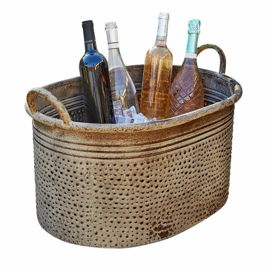 Die antik-finierte Eisenwanne verbindet praktische Funktionalität mit rustikalem Charme. Ihre robuste Bauweise und die liebevoll gestalteten Noppen machen sie zu einem langlebigen und dekorativen Stück, das Stil in jeden Raum bringt. Sie ist geräumig genug, um als Pflanzenbehälter für große Gewächse zu dienen, und gleichzeitig ideal, um bei einer Gartenparty als innovativer Getränkekühler zu fungieren. Stellen Sie sich vor, wie diese Wanne, bepflanzt mit farbenfrohen Blumen oder gefüllt mit einer Auswahl an Wein und Champagner, zum zentralen Mittelpunkt Ihrer nächsten Feier wird und für bewundernde Blicke sorgt.