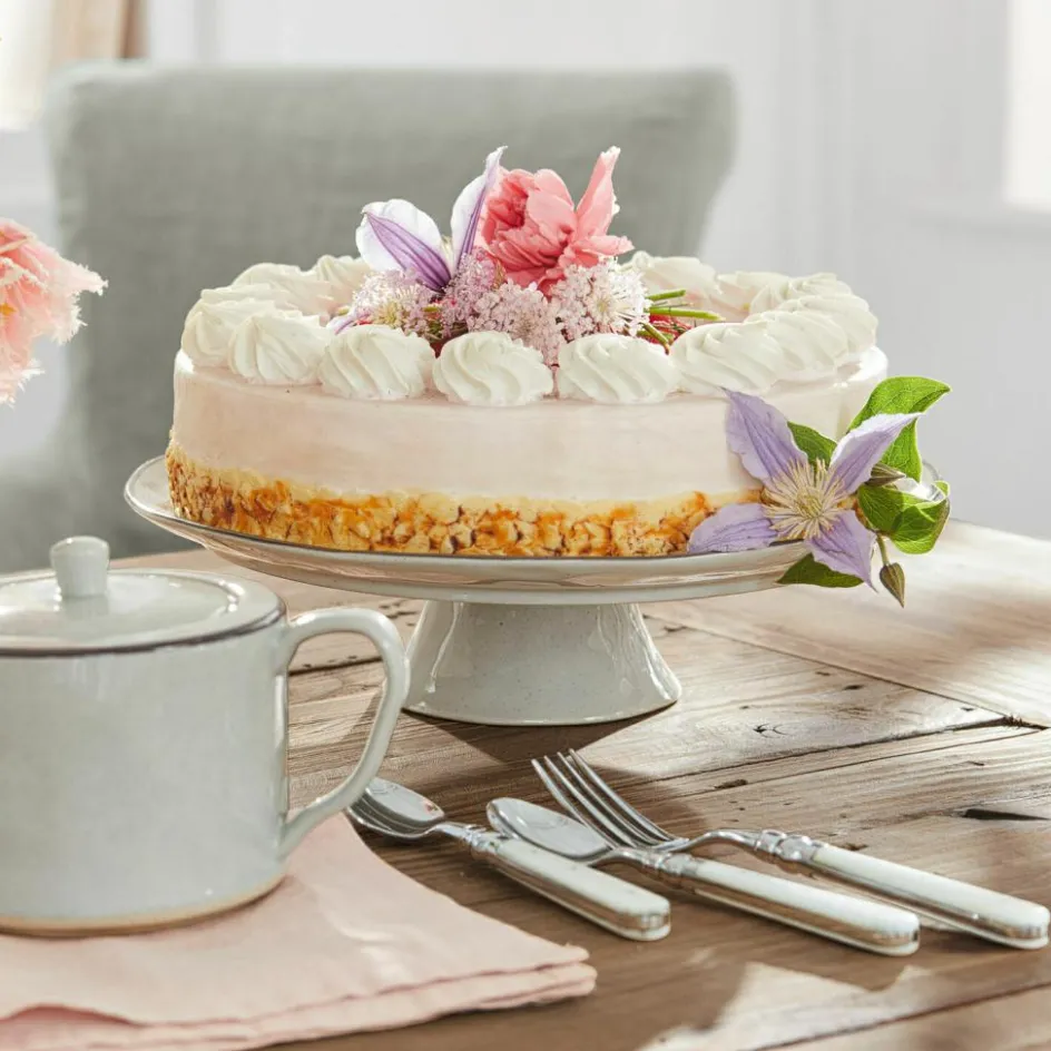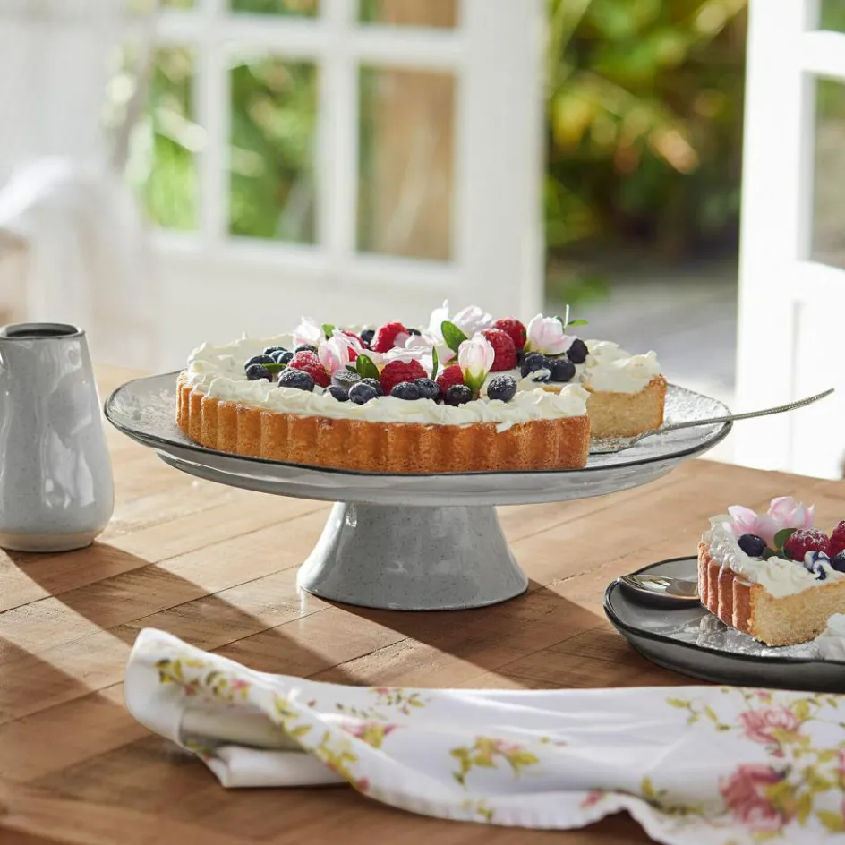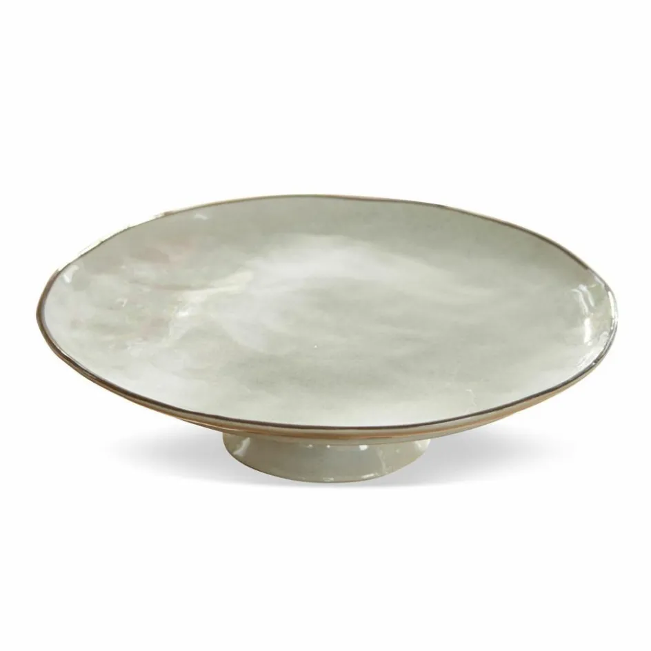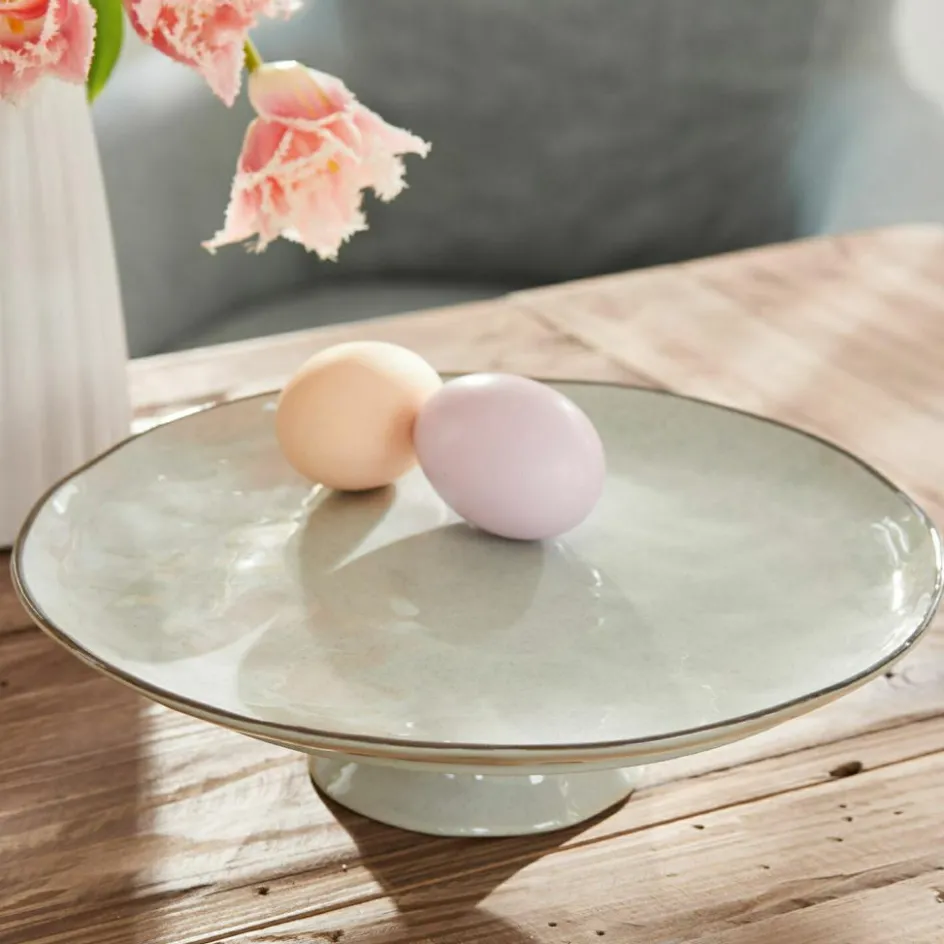 Dieses schicke Design hat ein ansprechendes, handgemachtes Design. Dafür sorgt die bewusst leicht unebene Gestaltung, die sich durch den hangetöpferten Herstellungsprozess ganz von alleine ergibt. Die hochwertige Platte mit farblich abgesetztem Rand besteht aus feinem Steinzeug mit glänzender Glasur und ruht auf einem eleganten Fuß. Sie lässt sich ausgesprochen vielseitig verwenden – arrangieren Sie darauf Gemüse oder Obst, richten Sie Leckereien zum Frühstück oder eine Käseplatte an oder platzieren Sie Naschwerk darauf. Hiermit kommt am Tisch und in der Küche noch mehr Genuss auf. Auch dekorativ lässt das edle Design sich kreativ nutzen, vielleicht mit hübschen Kristallen oder anderen Fundstücken dekoriert. Und wer möchte, könnte auch Make-up, Seifen oder Schmuckstücke darauf ablegen – ein echtes Multitalent im zeitlosen Look.