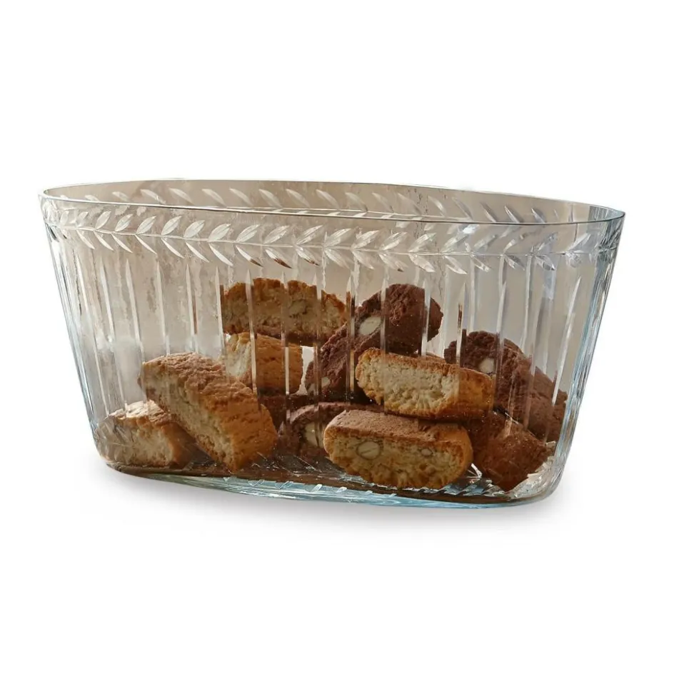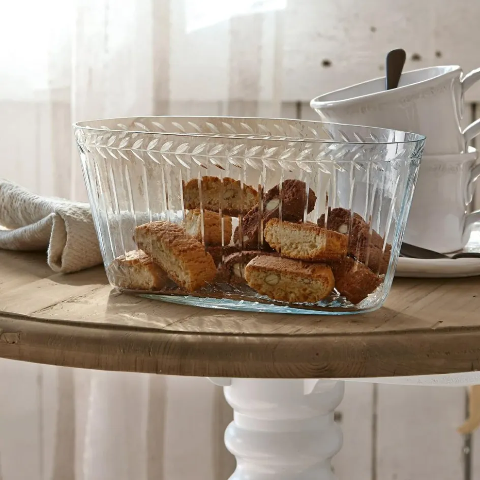 Wir lieben diese Schale! Ihre schlichte Eleganz, die charmante Form und ihre handgearbeitete Qualität, haben es uns angetan. Dieses Schmuckstück ist der Beweis dafür, dass hochwertiges Geschirr nicht teuer sein muss. Die bezaubernde Oberflächenstruktur verleiht der Schale ihren klassischen Charme. Besonders der feine Glasschliff entlang des Randes, weiß absolut zu begeistern. Das perfekte Geschirr, um stilvoll Brot, Chips oder andere Leckereien zu servieren.