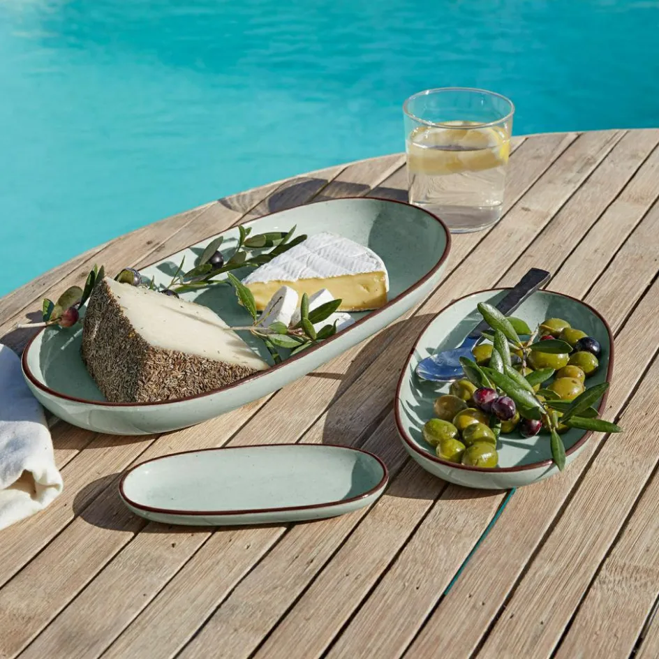 Edles Geschirr mit mediterranem Charakter – diese drei schönen Servierplatten bestehen aus handgetöpfertem und glänzend glasierten Steinzeug. Außer die Unterseite – diese zeigt sich ganz natürlich und beweist dadurch ihren ursprünglichen handgetöpferten Charme. Der farblich abgesetzte Rand ist sehr charmant, und im Set erhalten Sie diverse Größen. Hierin lassen sich wunderbar kleine Köstlichkeiten wie Obst, Brotscheiben, Nüsse oder Oliven anrichten. So nascht es sich mit Stil. Wer möchte, könnte auch dekorative Dinge darauf arrangieren oder die edlen Platten zur Aufbewahrung kleiner Gegenstände verwenden. Dieses stilsichere Design gefällt Ihnen? Dann können Sie noch viele weitere, perfekt passende Stücke der Biaré-Reihe bei uns im Onlineshop entdecken.