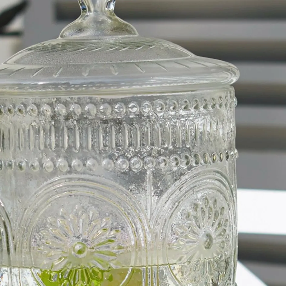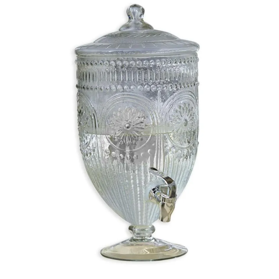 Dieser Getränkespender aus klarem Glas ist eine wahre Augenweide für Ihren Tisch. Wie ein überdimensionales kelchförmiges Kristallglas steht er da. Sein gesamter Glaskörper ist mit einem flächigen floralen Ornament verziert, das sich spürbar hervorhebt. Der silberfarbene Auslass ist mit einem praktischen Hebel versehen. Ob Sie bequem mit der Familie oder Freunden am Tisch sitzen oder sich während Ihrer Gartenarbeit einen erfrischenden Schluck holen möchten, das Zapfen des erfrischenden Getränks ist kinderleicht. Der große Glasdeckel schützt die Erfrischungen vor unliebsamen fliegenden Gästen Ihres Gartens. Für diesen Getränkespender bieten sich zahlreiche Gelegenheiten. Natürlich ist er auch auf der Küchenanrichte ein stilvoller Blickfang. Wenn Sie nach passenden Gläsern für diesen außergewöhnlichen Getränkespender suchen: Wir haben auch Trinkgläser im passenden antik erhabenen Design in unserem Sortiment zu bieten. Sie sind spülmaschinenfest und ebenso klar, wie der Getränkespender.