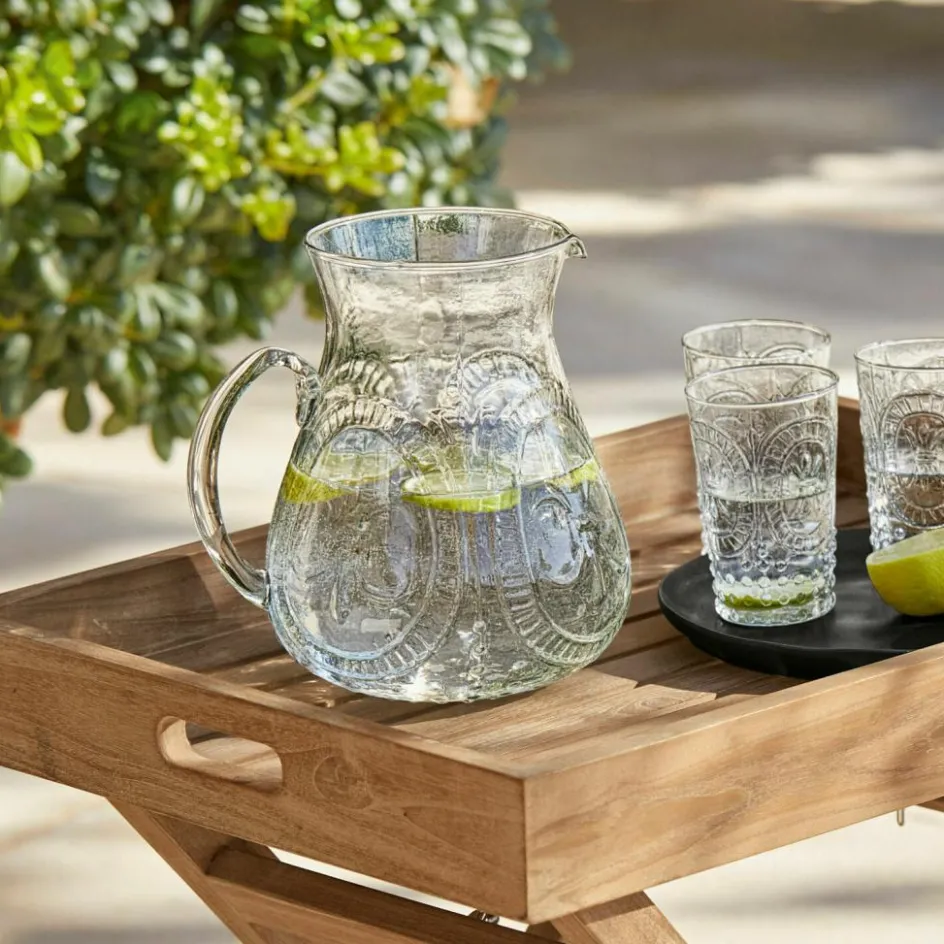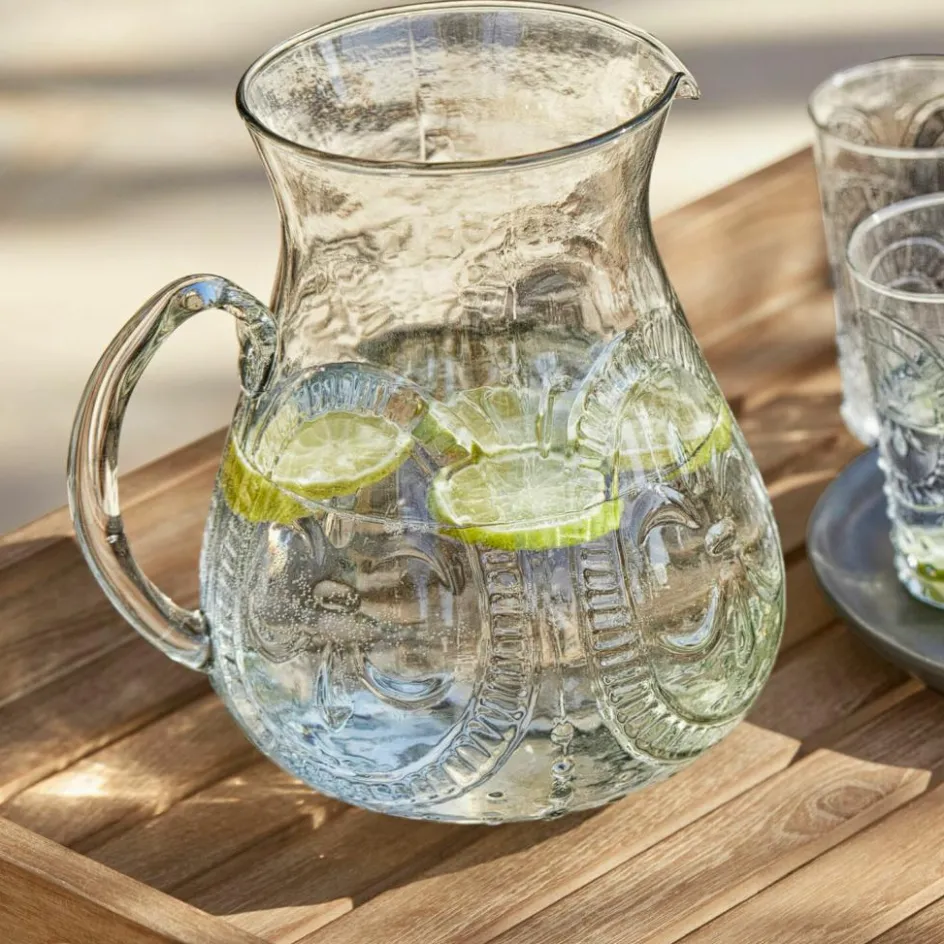 Ein wunderhübsches Design, das alle Vintage-Liebhaber sofort in ihr Herz schließen werden. Der elegante Krug aus klarem Glas ist mit einer feinen Lilien-Prägung geschmückt. Er ist das perfekte Accessoire, um eine Limonade, Eistee oder kühles Wasser mit Zitronenscheiben einzufüllen und somit an warmen Tagen immer genügend zu trinken. Ein wahres Schmuckstück für entspannte Stunden auf dem Balkon oder auf der sommerlich gedeckten Tafel im Garten. Kleine, aber feine Details wie dieses machen die warme Jahreszeit gleich noch ein bisschen schöner. Auch als hübsche Blumenvase lässt der gläserne Krug sich gut umfunktionieren.