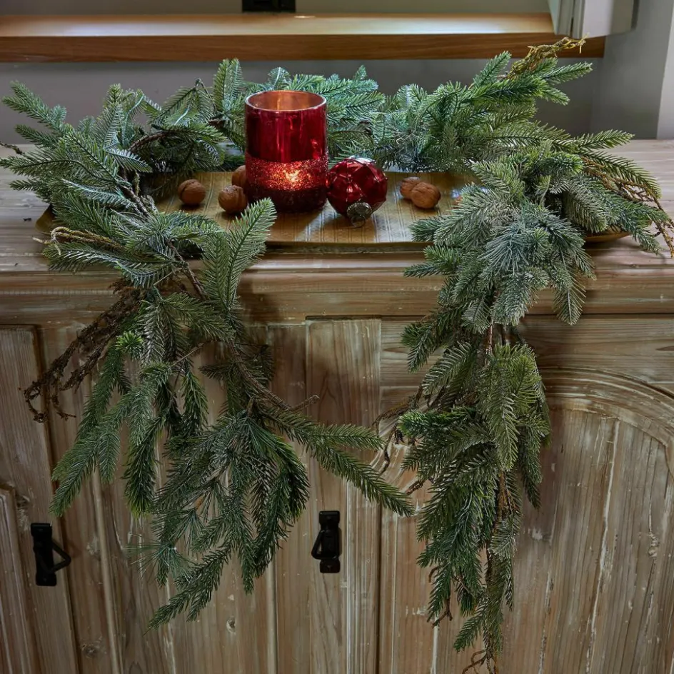 Ein Hauch von Winterwald, der niemals nadelt: Diese täuschend echte Tannengirlande begeistert mit ihrem lebendigen Nadelkleid in sanften Grüntönen. Unterschiedliche Zweigarten und Strukturen sorgen für ein besonders natürliches Gesamtbild, das durch zarte Moosakzente liebevoll ergänzt wird. Dank der flexiblen Basis lässt sich die Girlande ganz individuell drapieren – ob locker über einem Türbogen, kunstvoll um ein Geländer geschlungen oder als Highlight auf dem festlich gedeckten Tisch. Sie wirkt wie frisch gebunden, bleibt jedoch Jahr für Jahr wunderschön.