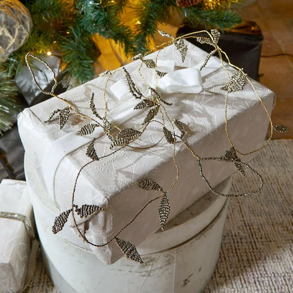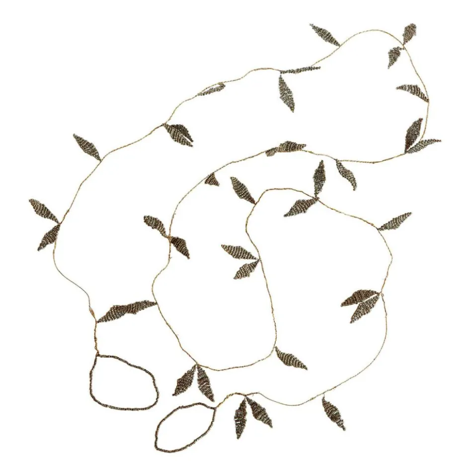 Ein Hauch von feinem Glanz, der wie ein leises Flüstern durch den Raum zieht: Diese zarte Girlande entfaltet ihre Wirkung durch filigran gefädelte Perlenblätter, die sich perfekt an den goldfarbenen Messingdraht schmiegen. Ihre Form erinnert an zart geschwungene Farnwedel oder elegante Federspitzen – von Hand zu kunstvollen Miniaturen gefügt. Der biegsame Draht erlaubt vielfältige Gestaltungen: locker über dem Kaminsims, elegant in einen Kranz eingeflochten oder als verspieltes Detail um Servietten oder Kerzen gewunden. Ein festliches Accessoire mit dezentem Glamour – ideal für festliche Anlässe, Feiertage oder einfach schöne Momente im Alltag.