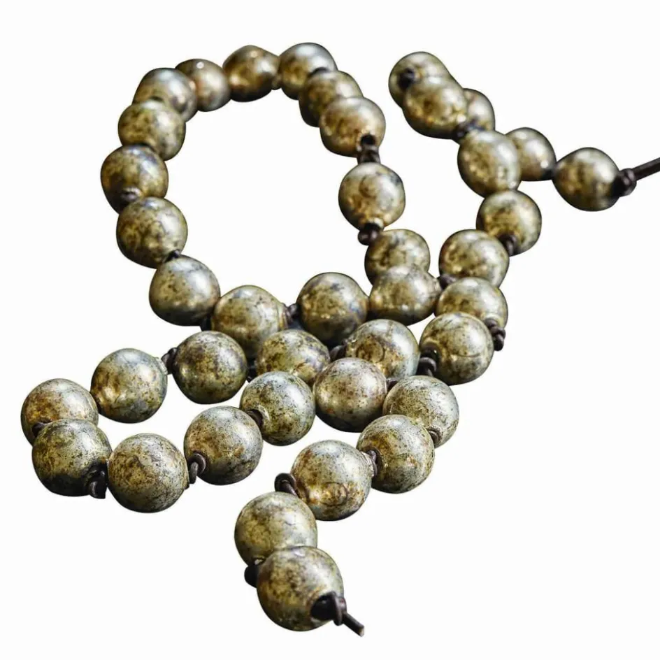 Wenn Sie etwas Besonderes für Ihre Dekoideen suchen, dann sollten Sie diese Girlande in Ihre Wahl mit einbeziehen. Denn sie brilliert mit antiker Schönheit und kunstvoller Machart. Jede Perle wird aus Glas mundgeblasen und mit silbrig schimmerndem Antik-Finish veredelt. In Vielzahl werden sie mit einer robusten Schnur aus Büffelleder sorgfältig von Hand aneinandergereiht, so dass eine einzigartige Maxi-Kette entsteht. Ein wunderschönes Accessoire, das nicht nur zur Weihnachtszeit glanzvollen Zauber versprüht – ob am Türrahmen, auf der Fensterbank oder auf der großen Festtagstafel.