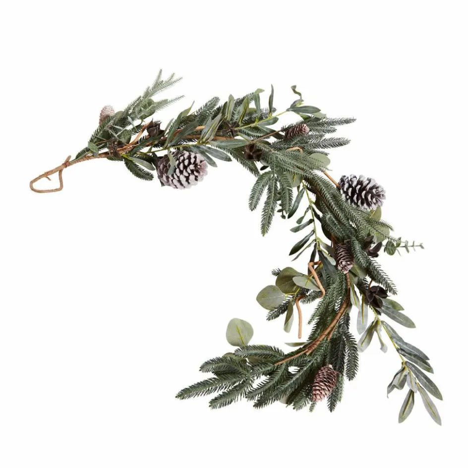 Holen Sie sich einen Hauch winterlichen Tannenwald nach Hause und freuen Sie sich auf diese stilvolle Girlande, welche wirklich sehr natürlich aussieht. Sie ist Tannennadeln und hübschen Blättern wie Eukalyptusblättern nachempfunden und mit echten Tannenzapfen geschmückt. Die detailreiche und liebevolle Gestaltung erfreut das Auge und passt sehr gut zum Landhaus-Stil. Das schöne Stück ist ganzjährig grün, ohne je zu nadeln und lässt sich so immer wieder verwenden und auch abwechslungsreich dekorieren – an einer Kaminkonsole, dem Fenster oder einem Dachbalken drapiert zaubert sie das Flair eines verschneiten Waldes in Ihr Zuhause und macht es richtig gemütlich.