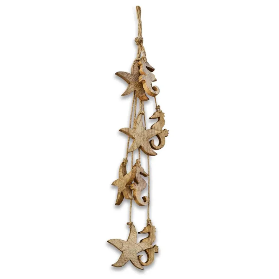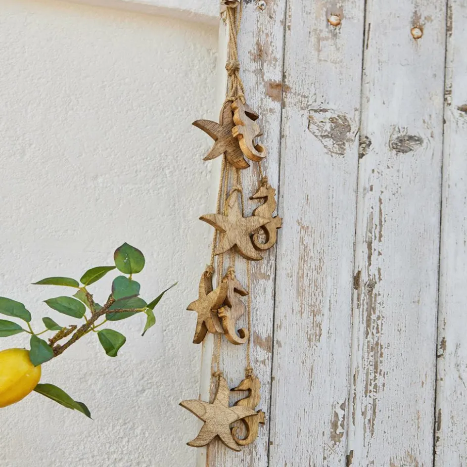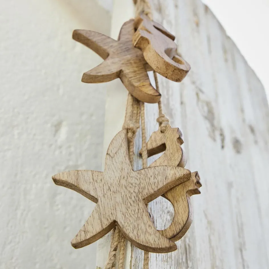 Diese Girlande aus natürlich schönem Mangoholz fügt ihrem Zuhause eine maritime Note hinzu, ohne zu dick aufzutragen. Subtil und stilvoll präsentiert sie die feine Maserung des Holzes und genau dadurch entsteht ein spannender Kontrast. Die stilisierten Meeresbewohner sind schließlich aus einem sehr erdverbundenen Naturmaterial geschnitzt. Das macht die Girlande zu einem vielseitigen Accessoire. Sie ist der perfekte Wandschmuck, lässt sich aber auch wunderschön mit anderen Deko-Objekten horizontal arrangieren.