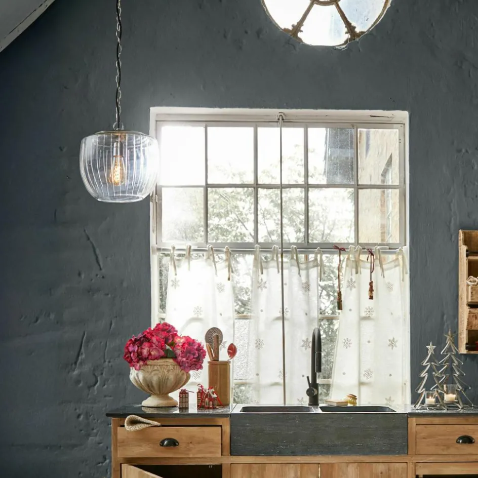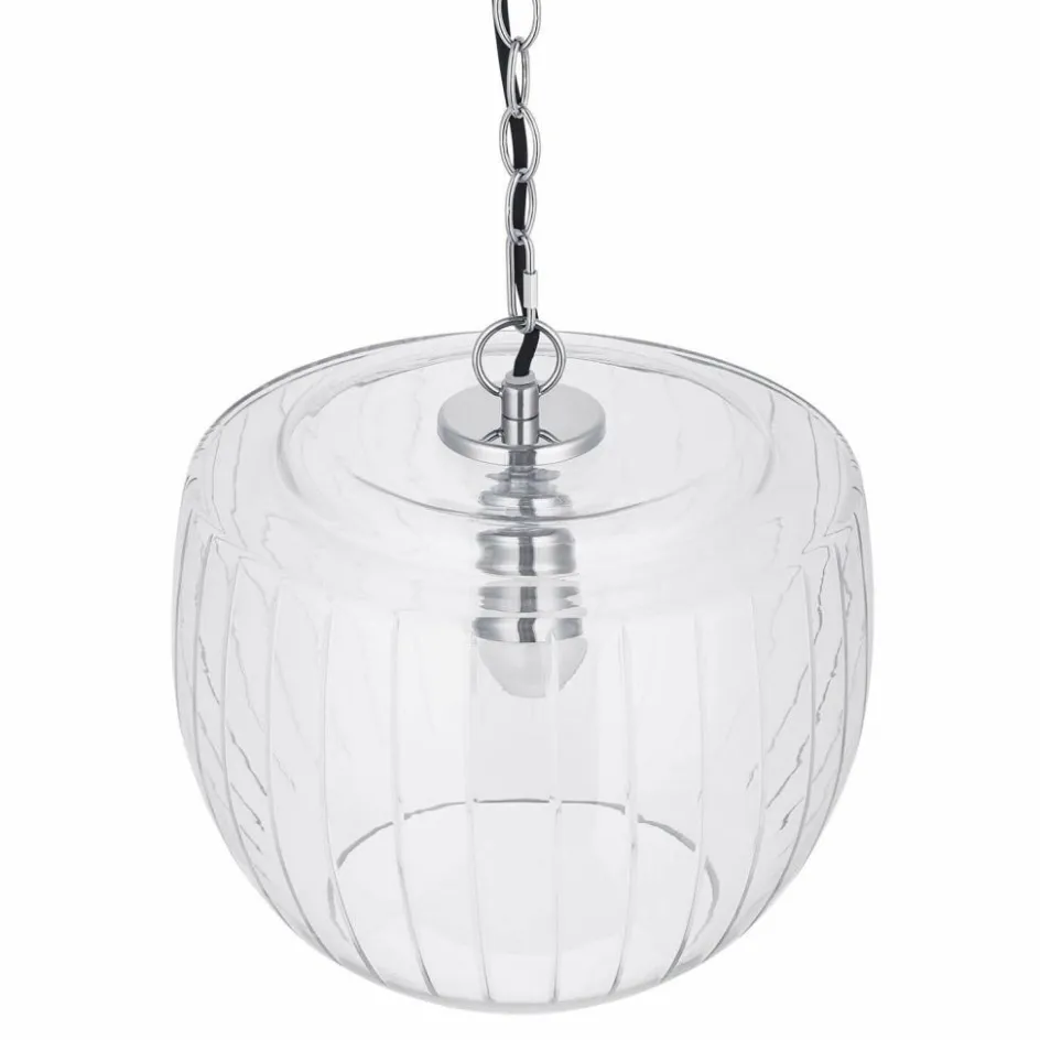 Man könnte meinen, ein Tropfen Licht sei in Glas gefangen worden – so zart und doch ausdrucksstark wirkt diese Hängelampe. Die mundgeblasene Glaskugel entfaltet mit ihren geschliffenen Rillen ein faszinierendes Spiel aus Reflexion und Transparenz. Jeder Blickwinkel offenbart neue Lichtlinien, die sich an der Oberfläche entlangziehen wie feine Strahlen. Das klare Glas wirkt dabei angenehm zurückhaltend, während das metallische Element am oberen Abschluss sowie die markante Gliederkette einen modernen Twist setzen. Ob über dem Esstisch, im Flur oder als einzelnes Statement in einer Leseecke – diese Leuchte bringt nicht nur Licht, sondern auch eine Prise Magie in den Raum.