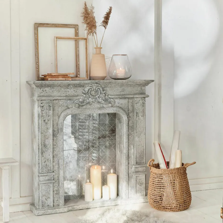 Die antik anmutende Kaminkonsole wurde in Handarbeit aus Holz gefertigt und mit aufwendigen Verzierungen aus Resin versehen. Ein spezielles Antik-Finish verleiht ihr den authentischen Look. Der Clou: Im Inneren der dekorativen Kaminumrahmung befindet sich ein Spiegel – ebenfalls auf alt gemacht. Der Effekt: Kerzenlicht von verschieden großen Stumpenkerzen wird wundervoll widergespiegelt und der Anschein eines Lichtermeeres erweckt. Romantische Stimmung ist so garantiert. Und: Sie haben endlich einen passenden Ort um die Weihnachtssocken aufzuhängen.