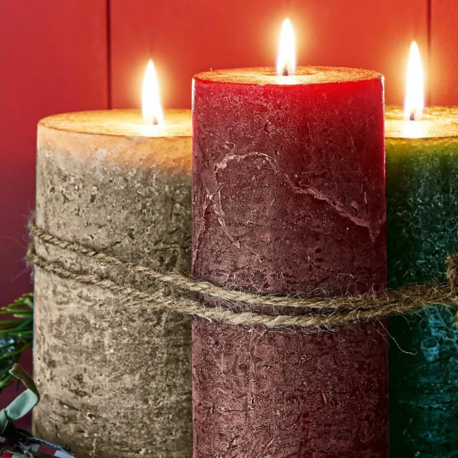 Keine andere Lichtquelle ist so stimmungsvoll wie das sanft flackernde Licht natürlicher Wachskerzen. Kein Wunder, dass sie besonders zur Weihnachtszeit Ihre Terrasse, Ihren Garten oder Ihre Innenräume in ein gemütliches Refugium verwandeln. Auch dieses rustikal anmutende 3er-Set in harmonischem Größen- und Farbspiel setzt wunderschöne Lichtakzente. Und wenn diese Kerzen auf Deko-Accessoires der unterschiedlichsten Art treffen, kann dies der Beginn einer zauberhaften Weihnachts-Inszenierung werden. So lassen sich mit Schätzen aus der Natur wie Beerenzweige, Tannenzapfen oder Nüssen wunderschöne Arrangements für den Kamin oder die festliche Tafel kreieren. Auf dem Fensterbrett verbreiten sie mit ihrem Kerzenschein einen magischen Zauber. Und die Laterne vor der Haustür erhellen sie mit reizvollem Lichterglanz. Die Kerzen sind gegossen und vollständig durchgefärbt und weisen durch eine spezielle Arbeitsweise eine schöne, marmorierte Oberfläche auf. Außerdem sind sie duftneutral, langlebig und erzeugen eine besonders hohe Leuchtintensität.