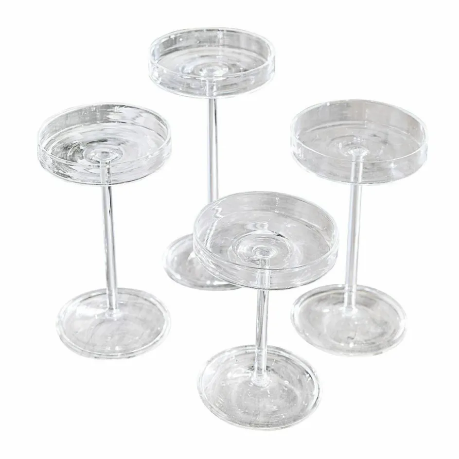 Diese vier edlen Kerzenhalter haben ein besonders filigranes und zartes Design, welches sie sehr elegant erscheinen lässt. Sie bestehen aus feinem, mundgeblasen Glas. Darin lassen sich Teelichter entzünden, sodass Sie am Tisch, auf der Fensterbank oder auf einer Anrichte gemütliches Licht genießen. Sie könnten daraus auch einen ganz individuellen Adventskranz zaubern, und wer möchte, könnte auch dekorative Kleinigkeiten wie Kristalle, Trockenblüten oder Muscheln darin arrangieren und so immer wieder neue Deko-Highlights schaffen. Auch für Schmuckstücke wie Ringe oder Ohrringe bieten diese gläsernen Accessoires ein wunderbares Plätzchen. Dank ihrer zeitlosen Optik harmonieren sie mit wirklich jedem Wohnstil und sind immer eine gute Wahl.
