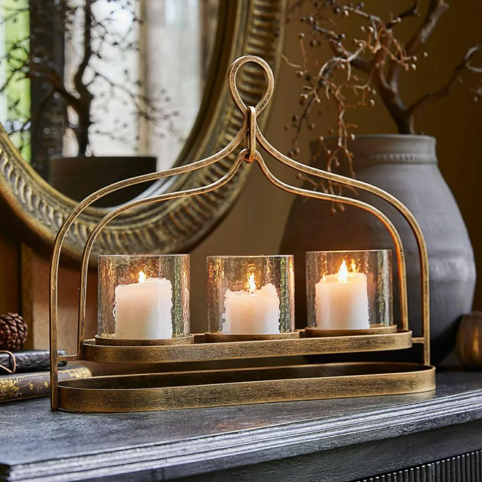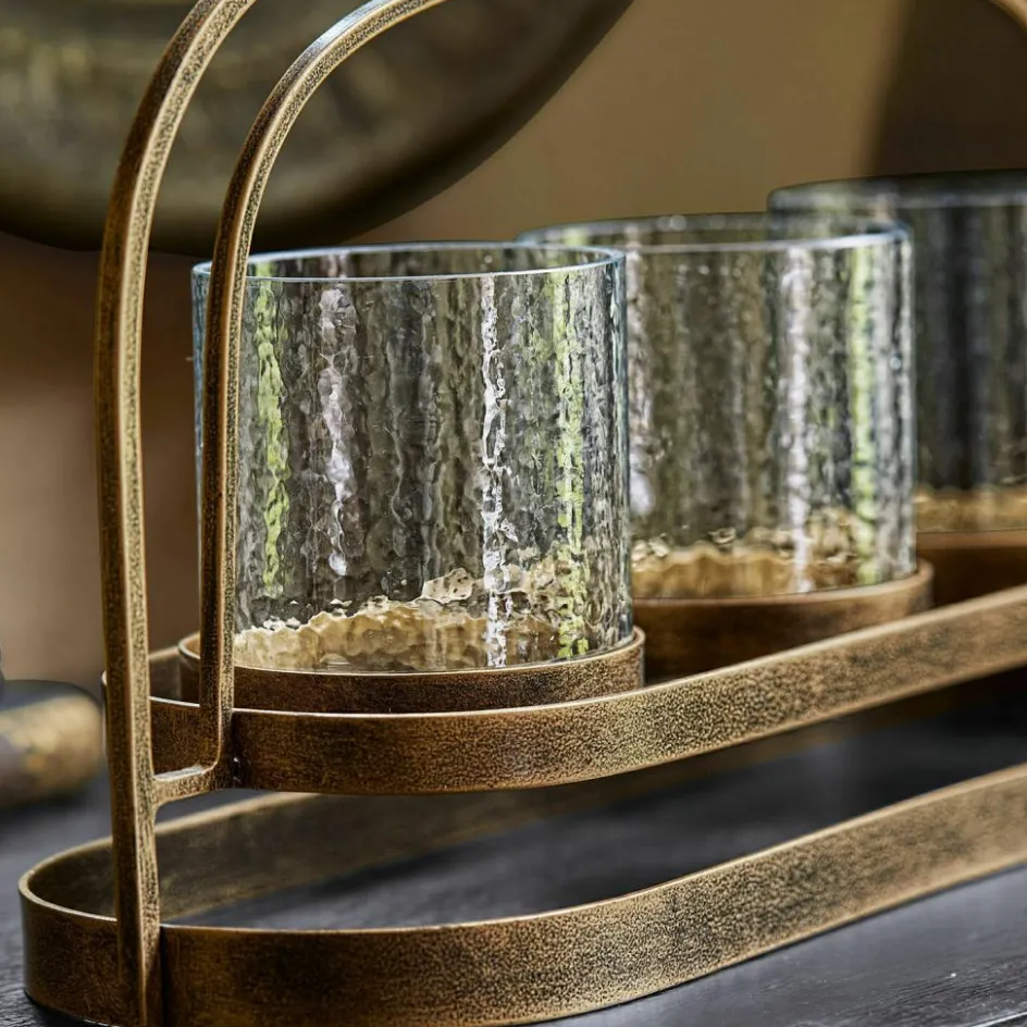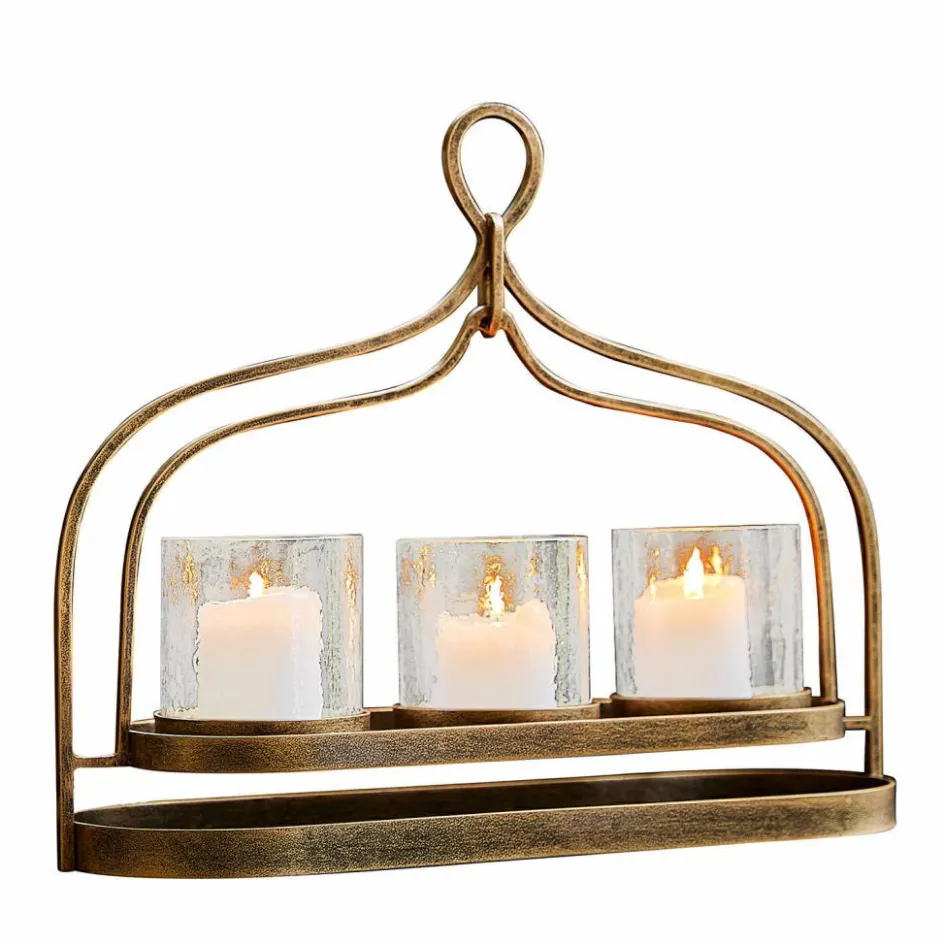 Stimmungsvollen Lichterglanz kann man in der dunklen Jahreszeit nie genug haben. Macht es doch jedes Ambiente noch einladender und gemütlicher. Dieser Kerzenhalter zaubert dazu noch einen Hauch von Orient in Ihr Zuhause – und ist auch ganz nach orientalischer Tradition sorgfältig von Hand gefertigt. Das schwungvoll gebogene Eisengestell weist ein goldfarbenes Antik-Finish auf und bildet die Basis für drei gläserne Zylinder, die auch abnehmbar sind. So wird das Bestücken mit Teelichtern oder kleinen Stumpenkerzen besonders einfach. Das stilvolle Accessoire verbreitet in jedem Interieur seinen Zauber – und ist ein wunderbares Geschenk für alle, die ausgewähltes Dekor lieben.