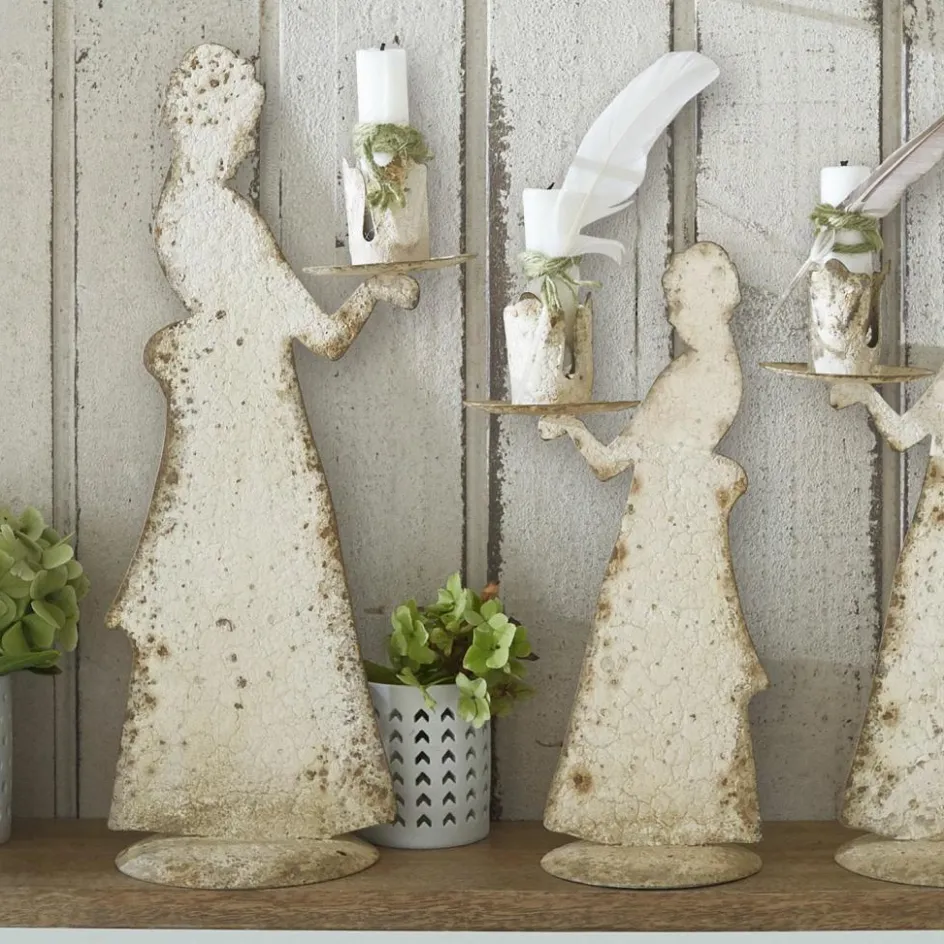 Dieses bezaubernde Trio wird aus Eisen gefertigt und aufwendig veredelt, um einen besonders authentischen Antik-Look zu erzielen. Die Silhouette der Kerzenständer ist nicht nur ein attraktiver Blickfang, sondern auch ein exzellenter Konversationsstarter. Ist die Form einem Dienstmädchen aus der Barockzeit nachempfunden? Die Umrisse könnten aber auch zu einer feinen Dame aus einer anderen Epoche gehören. Die Hauptsache ist, dass es sich um ein besonders hochwertiges Set handelt, das nicht nur Fans der Shabby Chic-Ästhetik begeistert. Alle drei Kerzenhalter sind perfekt für handelsübliche Stabkerzen und verleihen Ihrem Zuhause romantisches Vintage-Flair.