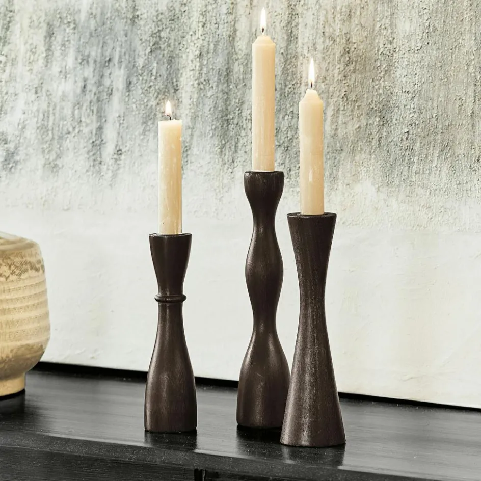 Verleihen Sie Ihrem Zuhause einen Hauch von Eleganz und Wärme mit diesem beeindruckenden Kerzenständer-Set aus Mangoholz. Das einzigartige Burned-Finish und die geschwungenen Formen machen diese Kerzenhalter zu einem wahren Blickfang. Die tiefschwarze Farbe sorgt für einen starken Kontrast und eine edle Atmosphäre, die jeden Raum verzaubert. Diese handgefertigten Stücke sind ideal für Stabkerzen und setzen stilvolle Akzente auf Ihrem Esstisch, Sideboard oder in Ihrem Wohnzimmer. Genießen Sie gemütliche Stunden im Kerzenschein und lassen Sie sich von der besonderen Haptik und dem exklusiven Design begeistern.