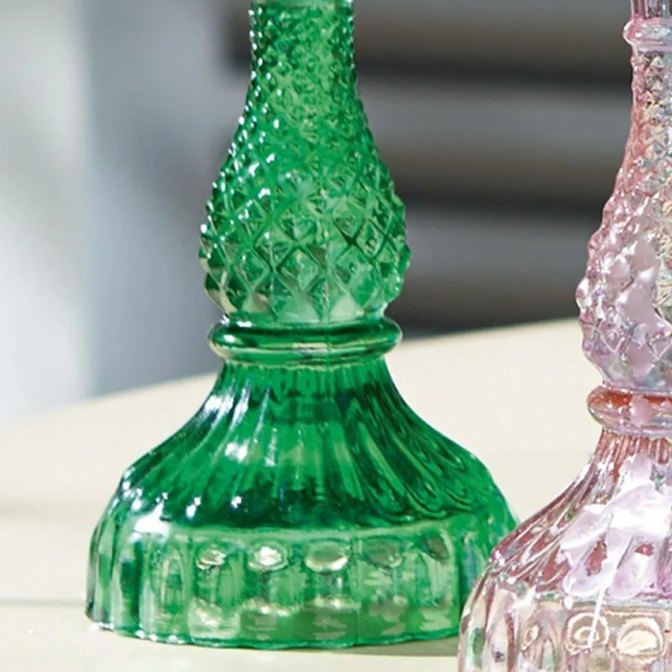 Das Kerzenleuchter Set verbindet moderne Farben und antike Klassiker aus Glas kontrastreich und besonders harmonisch. Diese Kerzenleuchter sind in klassischen Einrichtungsstilen ebenso Zuhause wie in sehr modern ausgerichtetem Ambiente. Diesen Spagat schaffen nur sehr wenige Dekorationsstücke. Dieses 6er Set umfasst drei verschiedene Größen in sechs frischen, modernen Farben. Die Farben wurden mithilfe von bunten Folien auf die Gläser aufgebracht. Sie wirken sowohl mit gewöhnlichen Haushaltskerzen und mit langgezogenen Tafelkerzen. Wenn Sie das Augenmerk auf die vielen verschiedenen Farben legen möchten, dann können Kerzen in jeweils passenden Farben ein extravaganter Stilbruch sein. Ein sehr individueller Stil, der auch in modernen Einrichtungsstilen auffällt. Hier wäre beispielsweise eine blaue Kerze im blauen Kerzenständer oder, komplementär, eine Rote im blauen Leuchter möglich. Mit weißen, silberfarbenen oder cremefarbenen Kerzen betonen Sie die klassische Linie der facettierten Leuchter. Das dicke Glas der Kerzenleuchter ist trotz seiner filigranen Antik-Facetten sehr robust und kann ganz einfach gereinigt werden.
